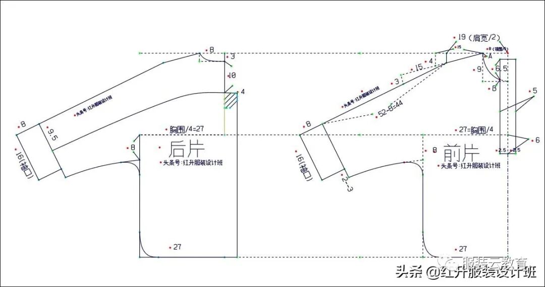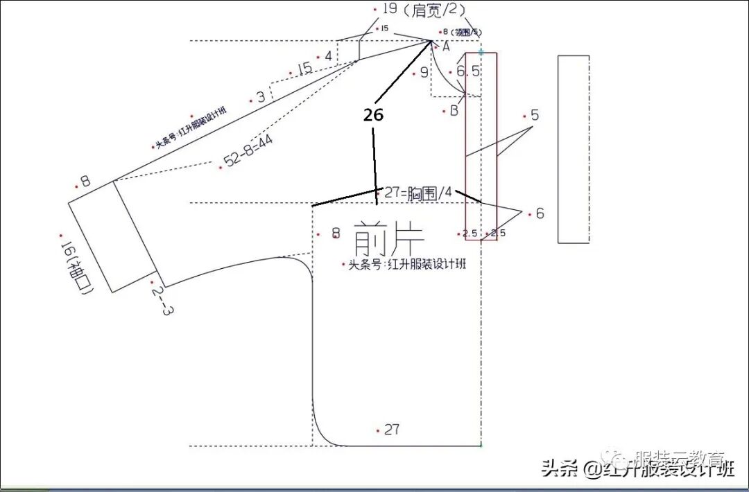 前片的裁剪图,红色是门襟的制版复制出来到右边以后,注意是虚线的地方是对折的,所以这个门襟的净线宽度是10厘米,并且裁剪2个,落肩从A点向左15厘米,然后向下4厘米产生一个点,然后同A点相连产生肩斜线,然后取肩宽19厘米,垂直拉下至肩斜,产生的点交点沿肩斜延长15厘米,直角下落3厘米后,连接肩点产生袖子的斜度,其他就简单了,大家可结合下视频,会更加清晰。