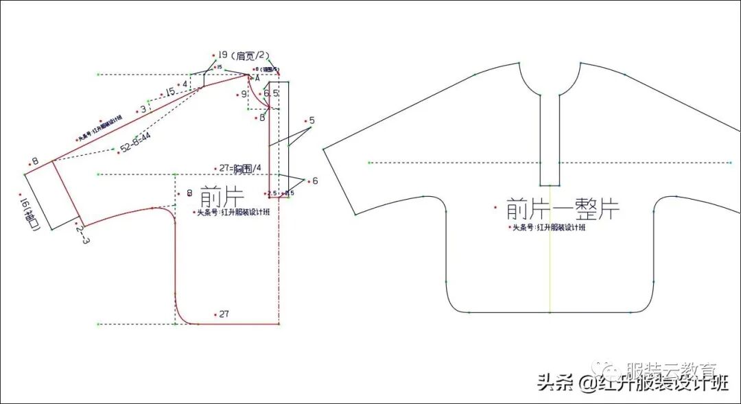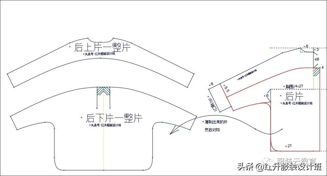 沿左图红色区域的线,复制出来右边的前片,然后以中间为对称轴对称过去,形成一个大的整片。