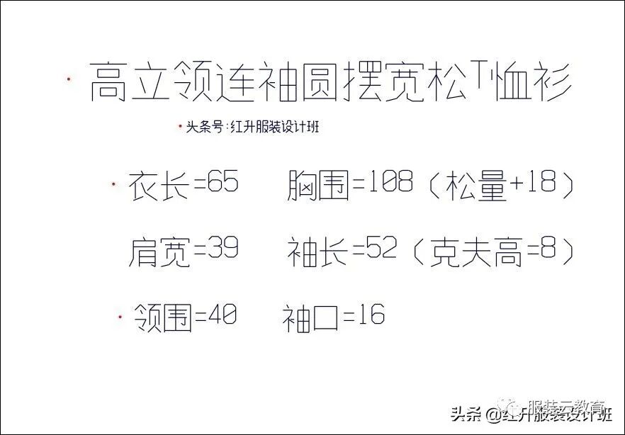 此款胸围加放松量18厘米,袖笼深26厘米。属于宽松风格的设计,适合体重125斤以下的同学穿着。