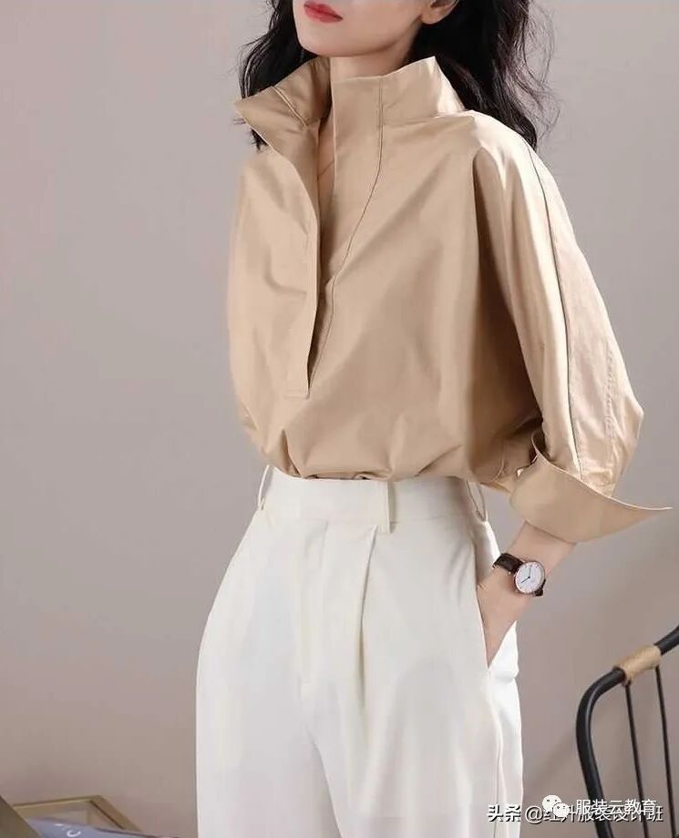 今天介绍的这款套头T恤衫很有品味,比较适合现在的季节穿着。特别是高立领与门襟位置的设计,"男性化"风格特点非常明显,给人以英姿飒爽,干练精神的感觉,气质也气势,配上半身裙或者长裤都有不错的效果,是你春秋季节非常有必要考虑的一款衬衣。