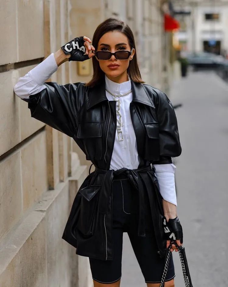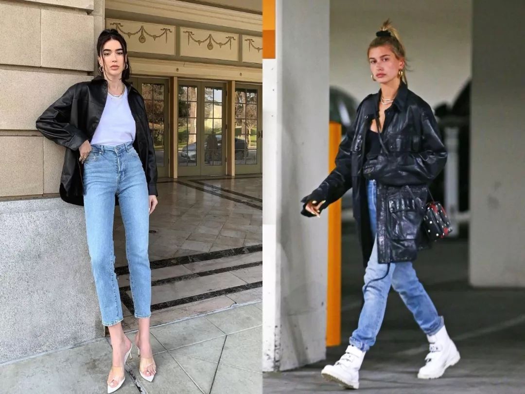 搭配的话,只要用最简单的基础款单品来搭配皮质单品,皮质单品的厚重感正好用基础款单品的简约感来中和,以此来凸显皮质单品的飒爽感就足够了。