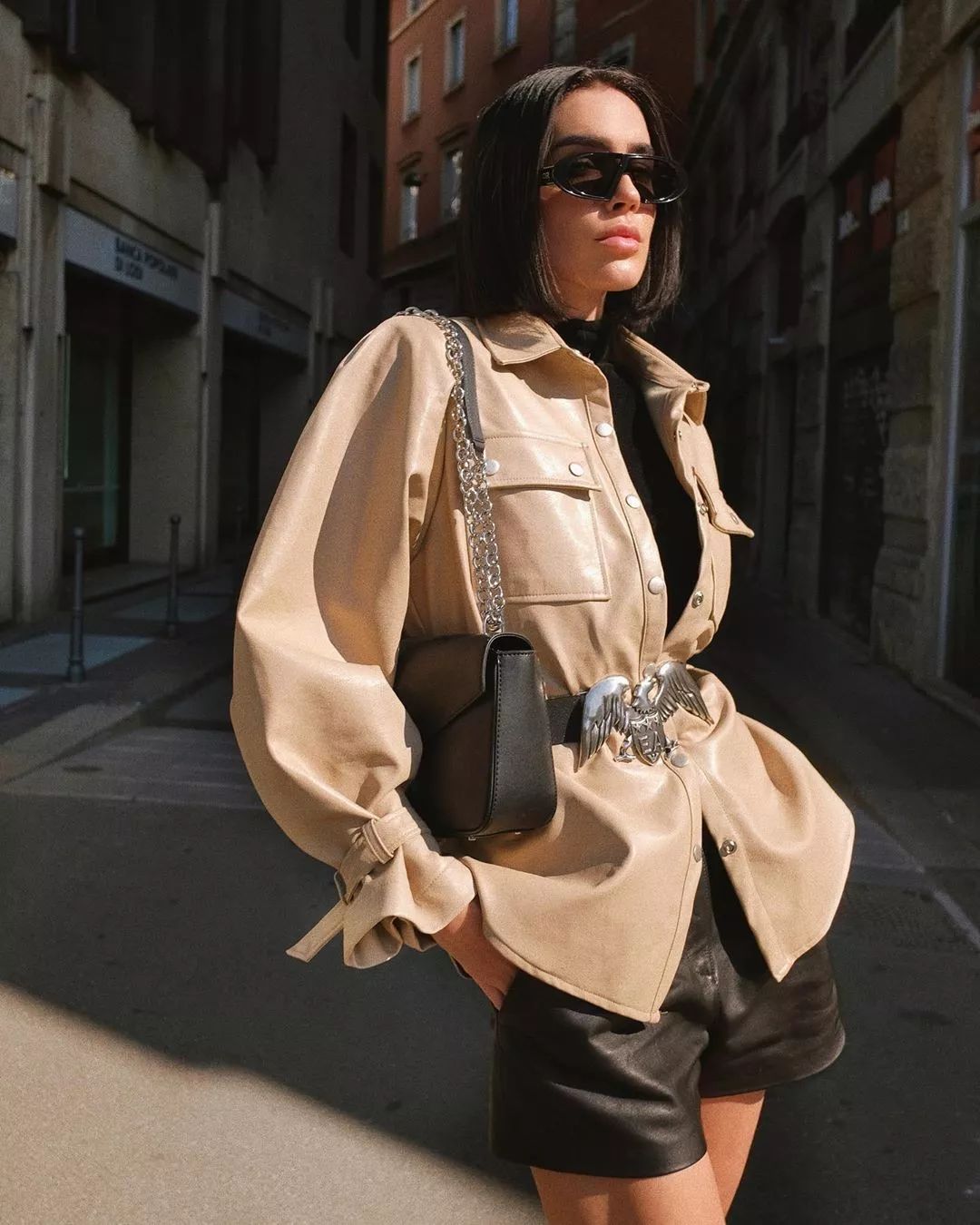 比较常见的Shacket款式就是皮革的,能抵御早春的冷风,也能让夹克外套变得更有质感。