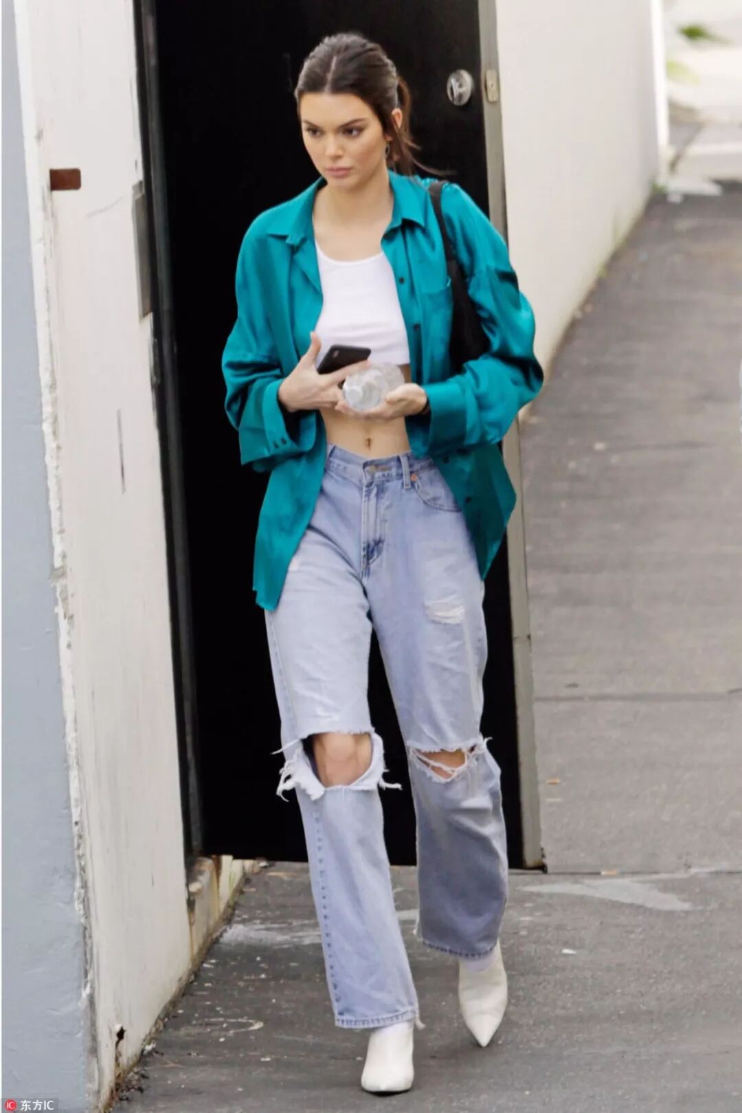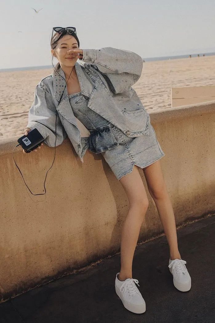 或者直接选择短裤或短裙的搭配,露出腿部的线条,也有显瘦的效果。