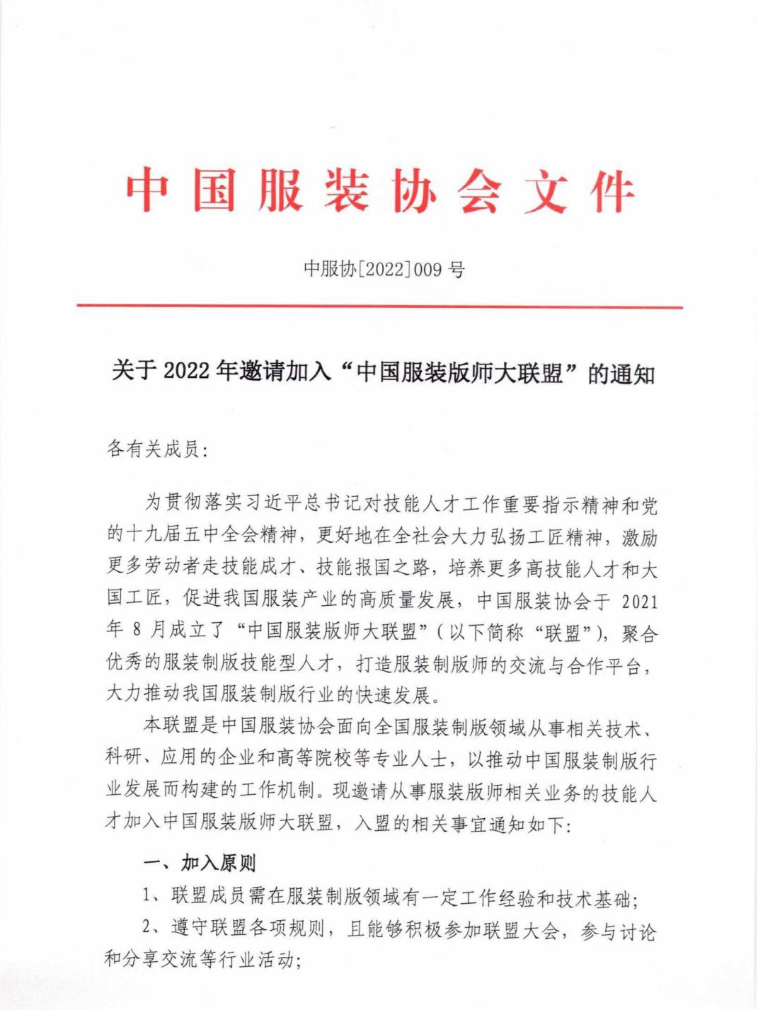 本联盟是中国服装协会面向全国服装制版领域从事相关技术、科研、应用的企业和高等院校等专业人士,以推动中国服装制版行业发展而构建的工作机制。现邀请从事服装版师相关业务的技能人才加入中国服装版师大联盟,入盟的相关事宜通知如下: