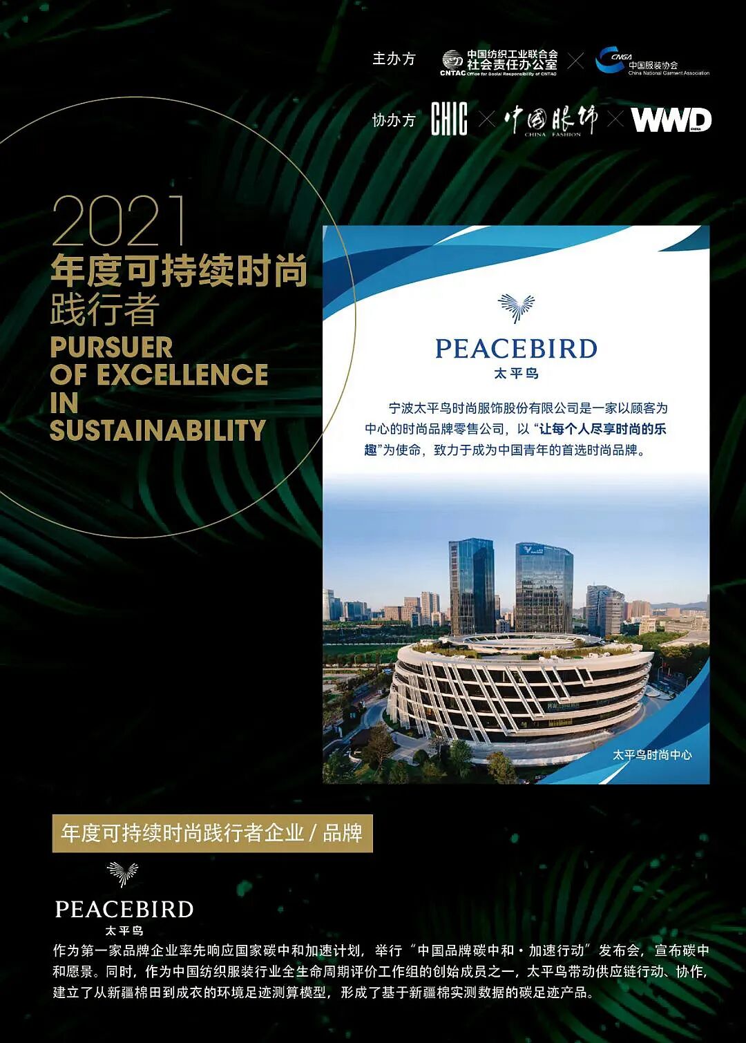 随着消费者环保意识不断加强,绿色消费与可持续时尚逐渐成为一种潮流。而服装纺织企业以时尚为核心,以服装为载体,不断强化快速反应能力,以可持续时尚发展引领者的姿态践行自己的责任与使命。本期关注年度可持续时尚践行者——宁波太平鸟时尚服饰股份有限公司。