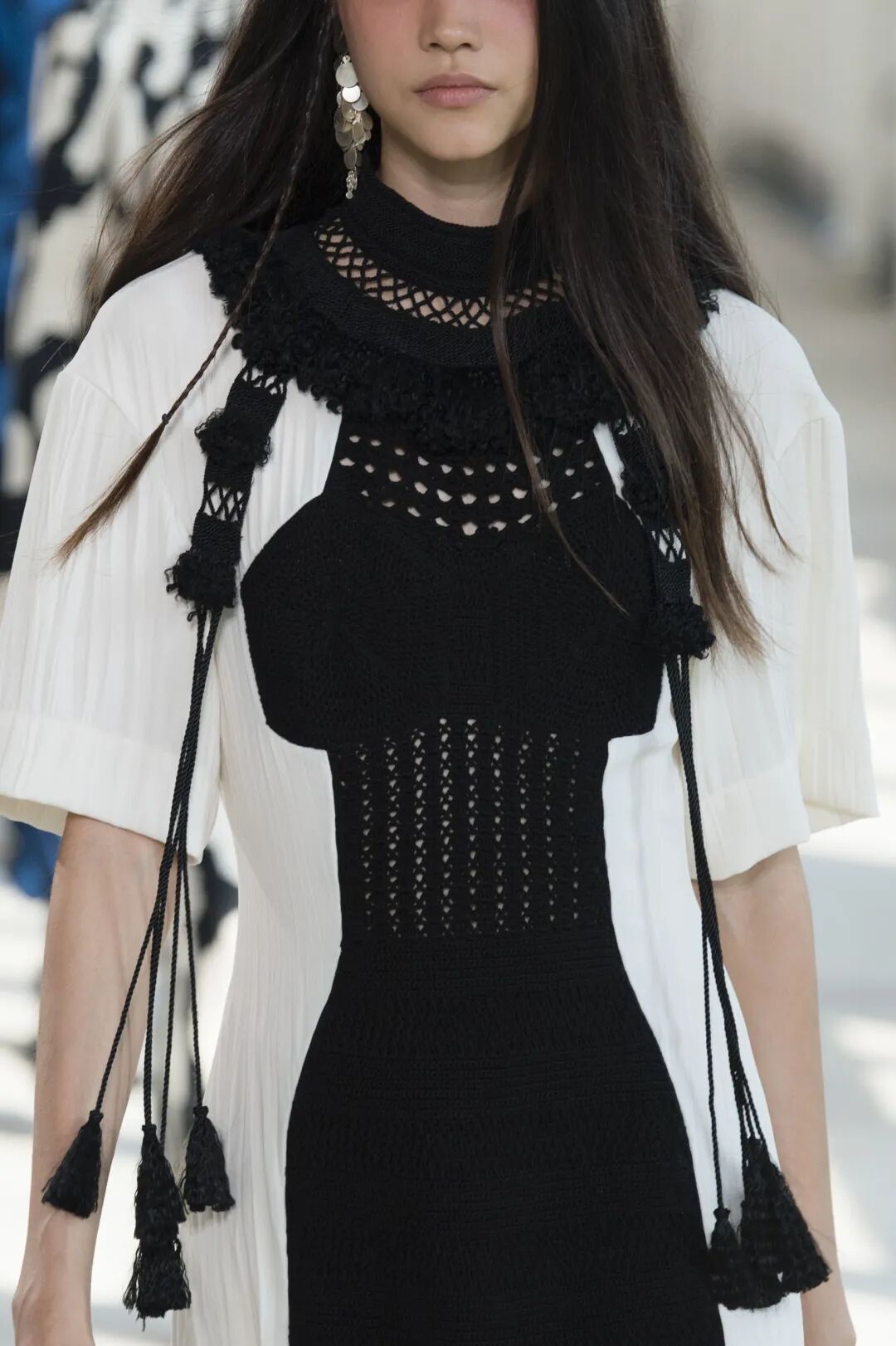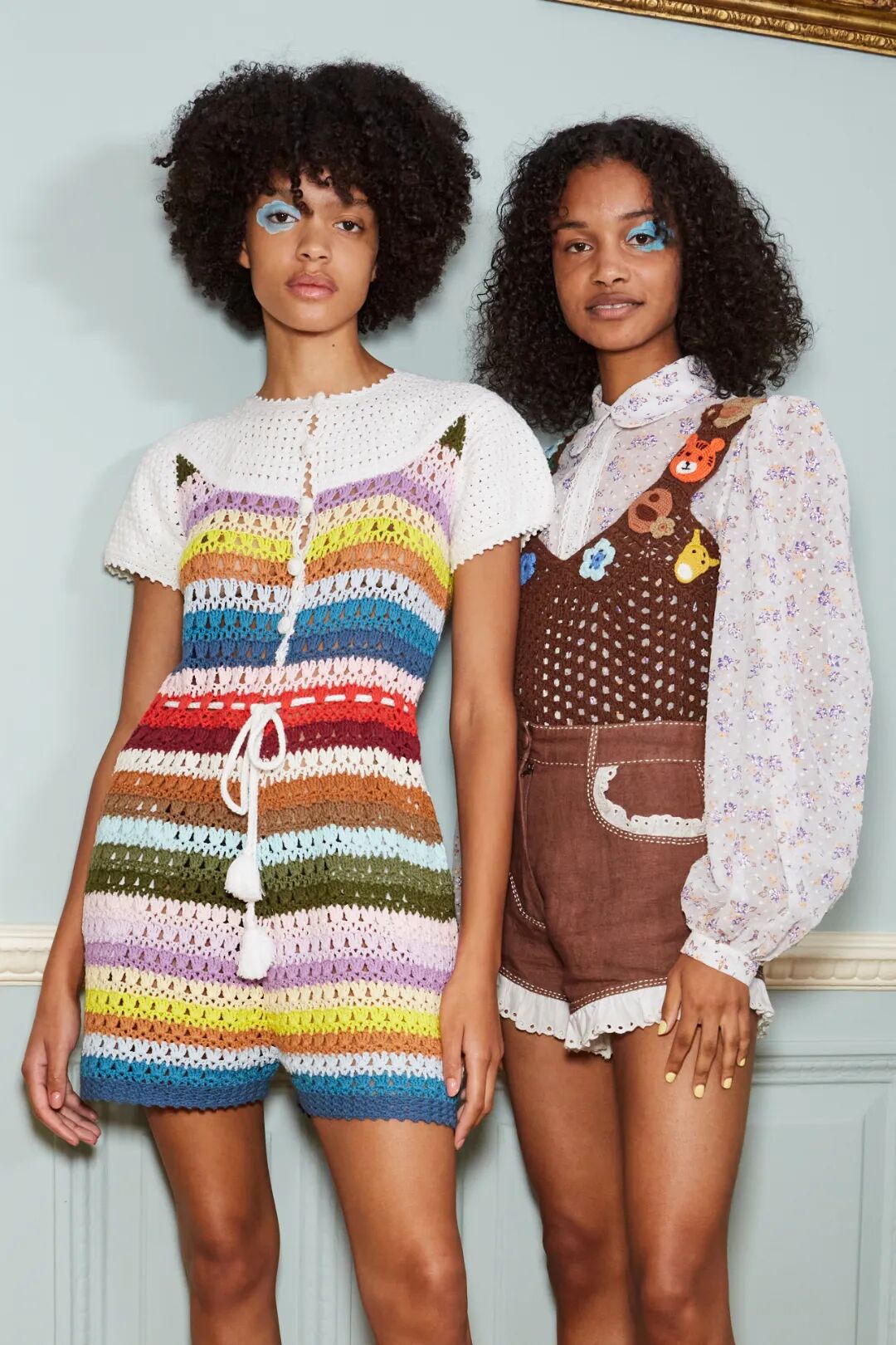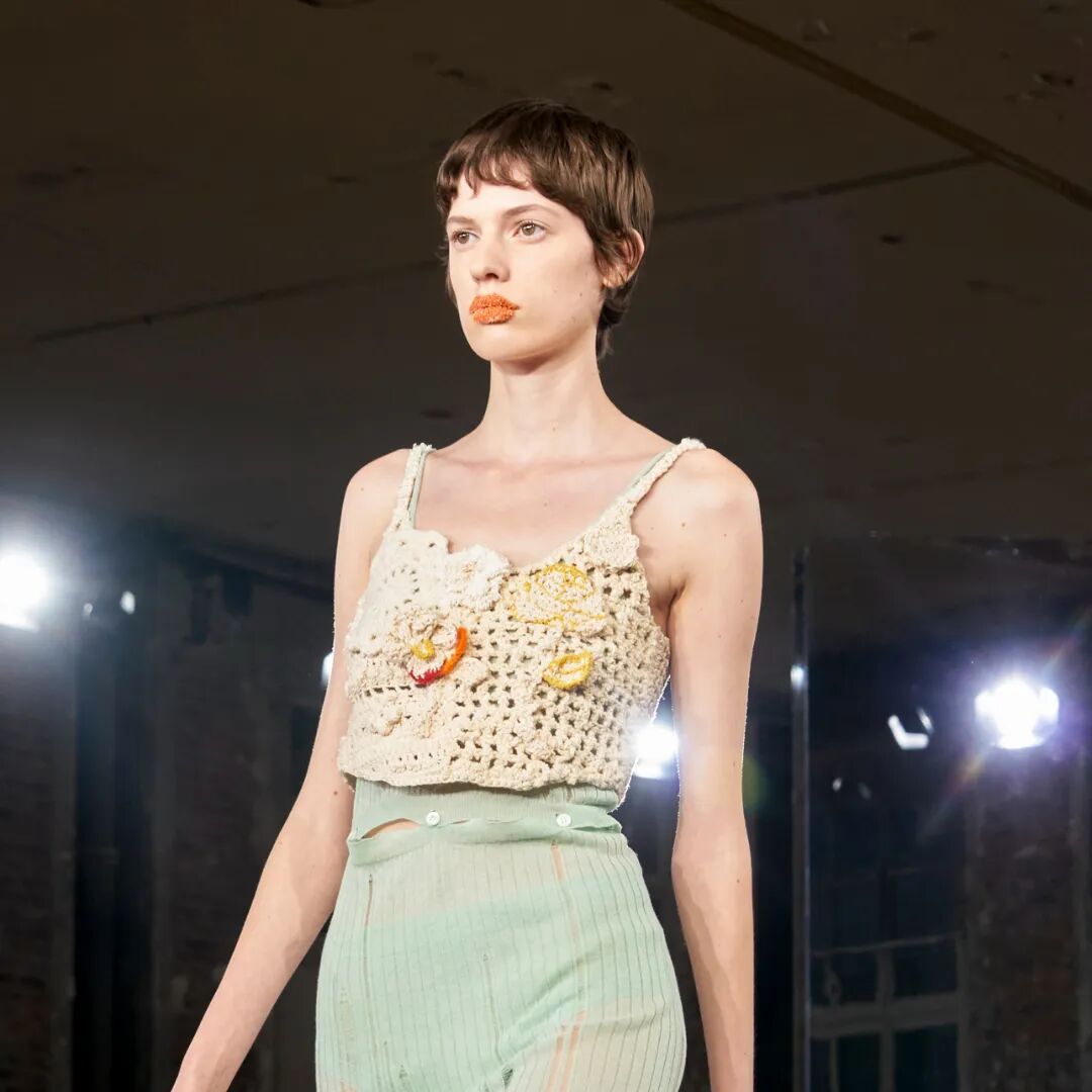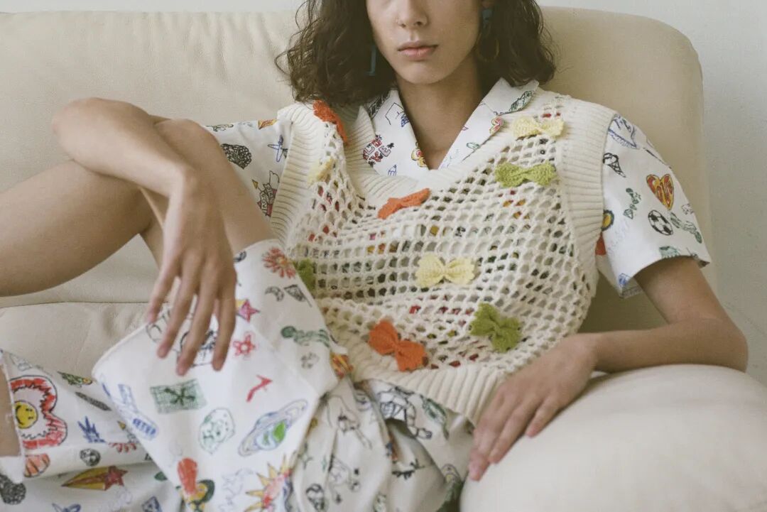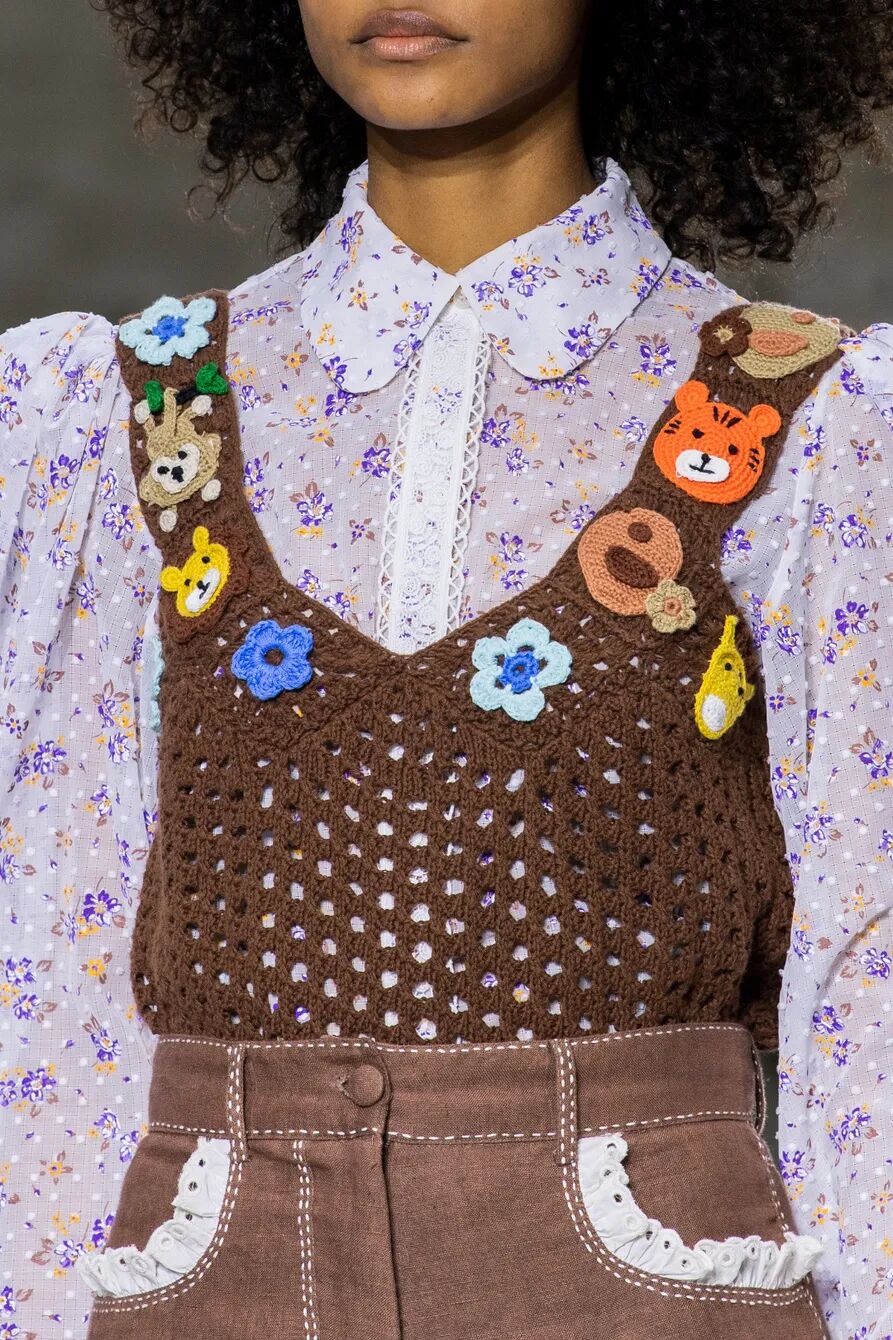 包括钩编花卉、镂空针织在内的多种花样纹理汇聚于此。手工编织不仅可以作为单品的细节点缀,也可用于简约的全身造型,还可通过不同色彩、不同质地的纱线混纺达成独具特色的风格化外观