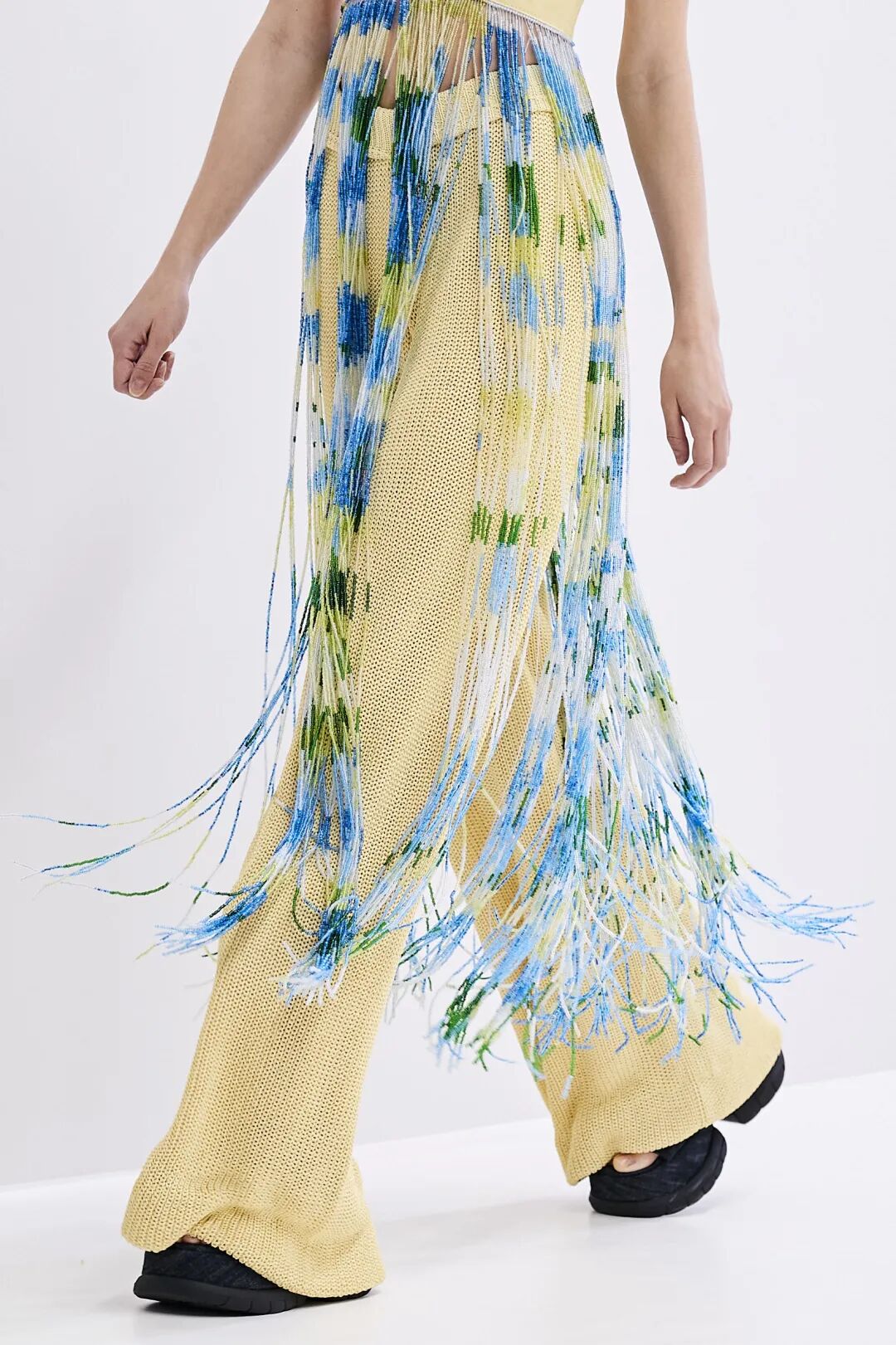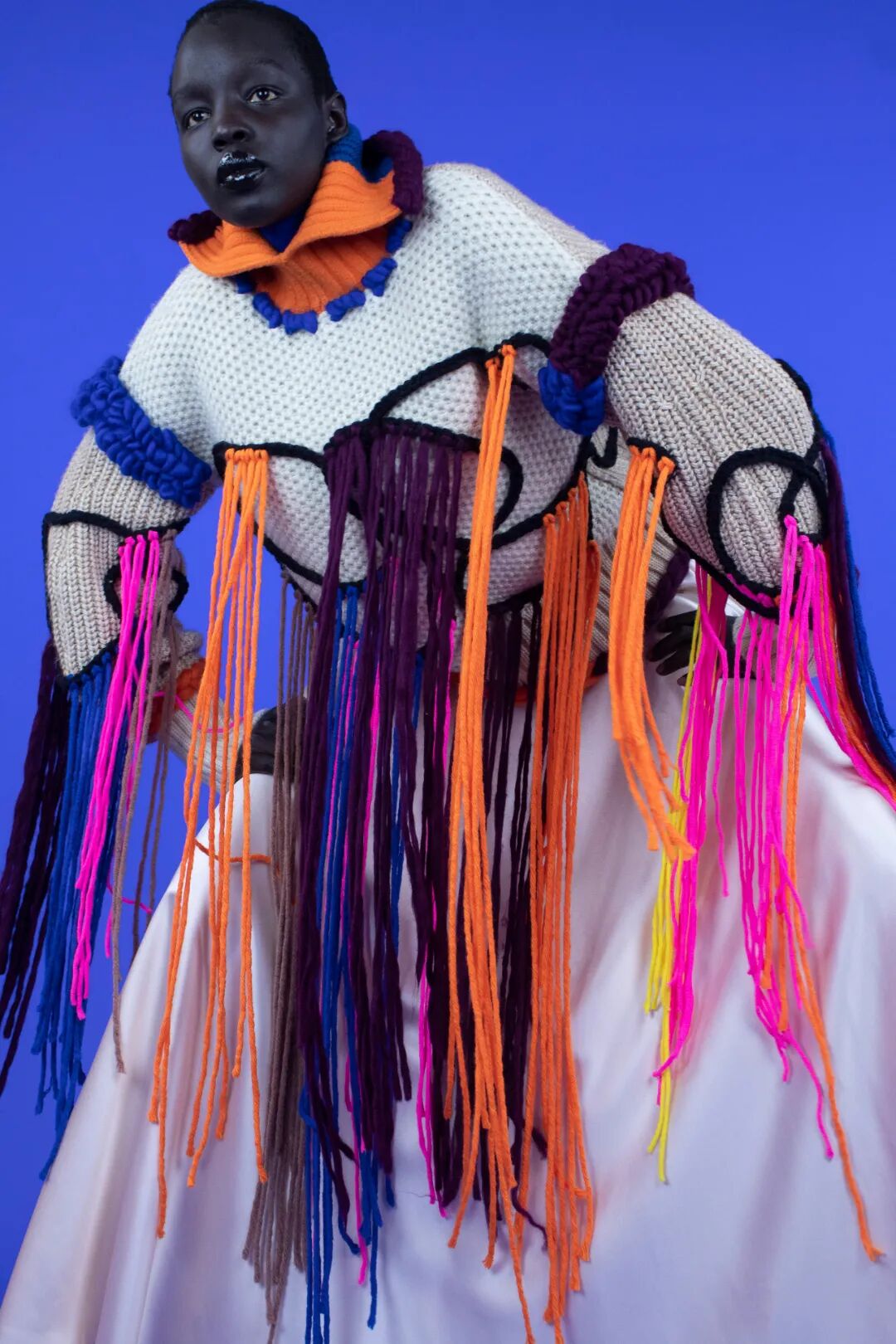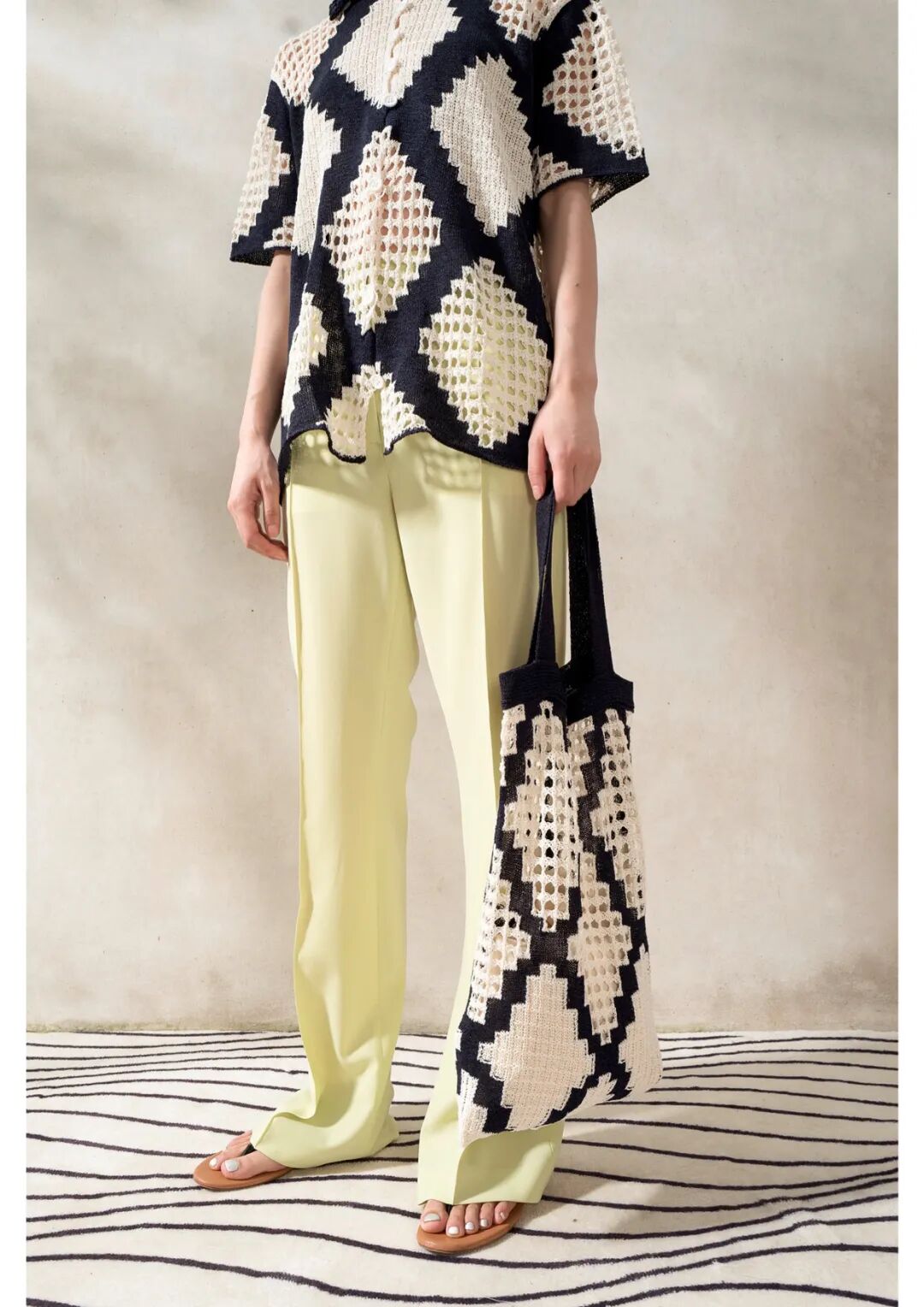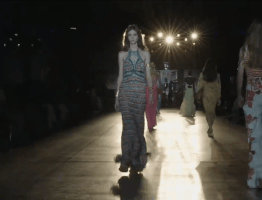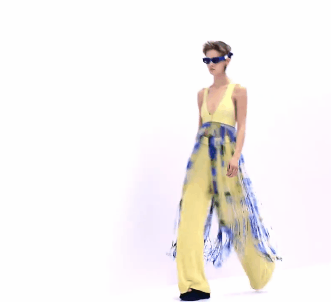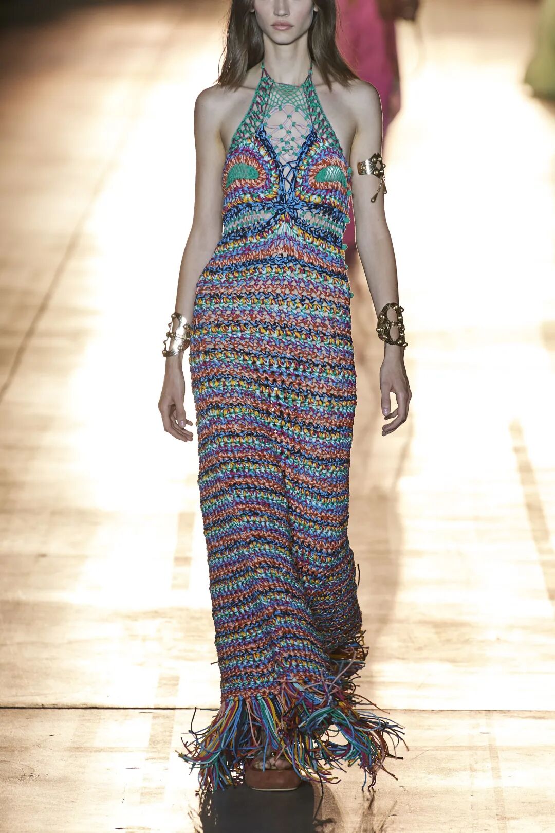 包括钩编花卉、镂空针织在内的多种花样纹理汇聚于此。手工编织不仅可以作为单品的细节点缀,也可用于简约的全身造型,还可通过不同色彩、不同质地的纱线混纺达成独具特色的风格化外观