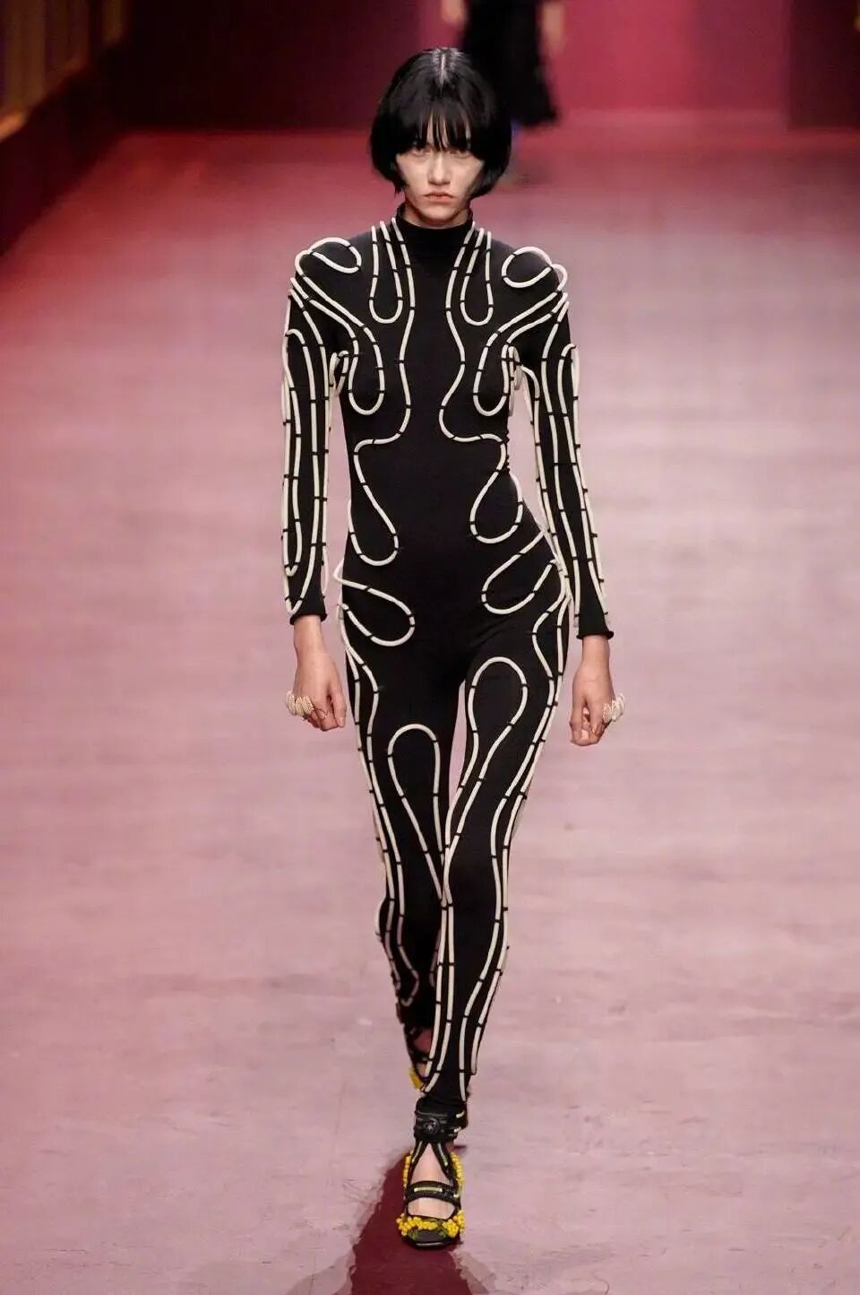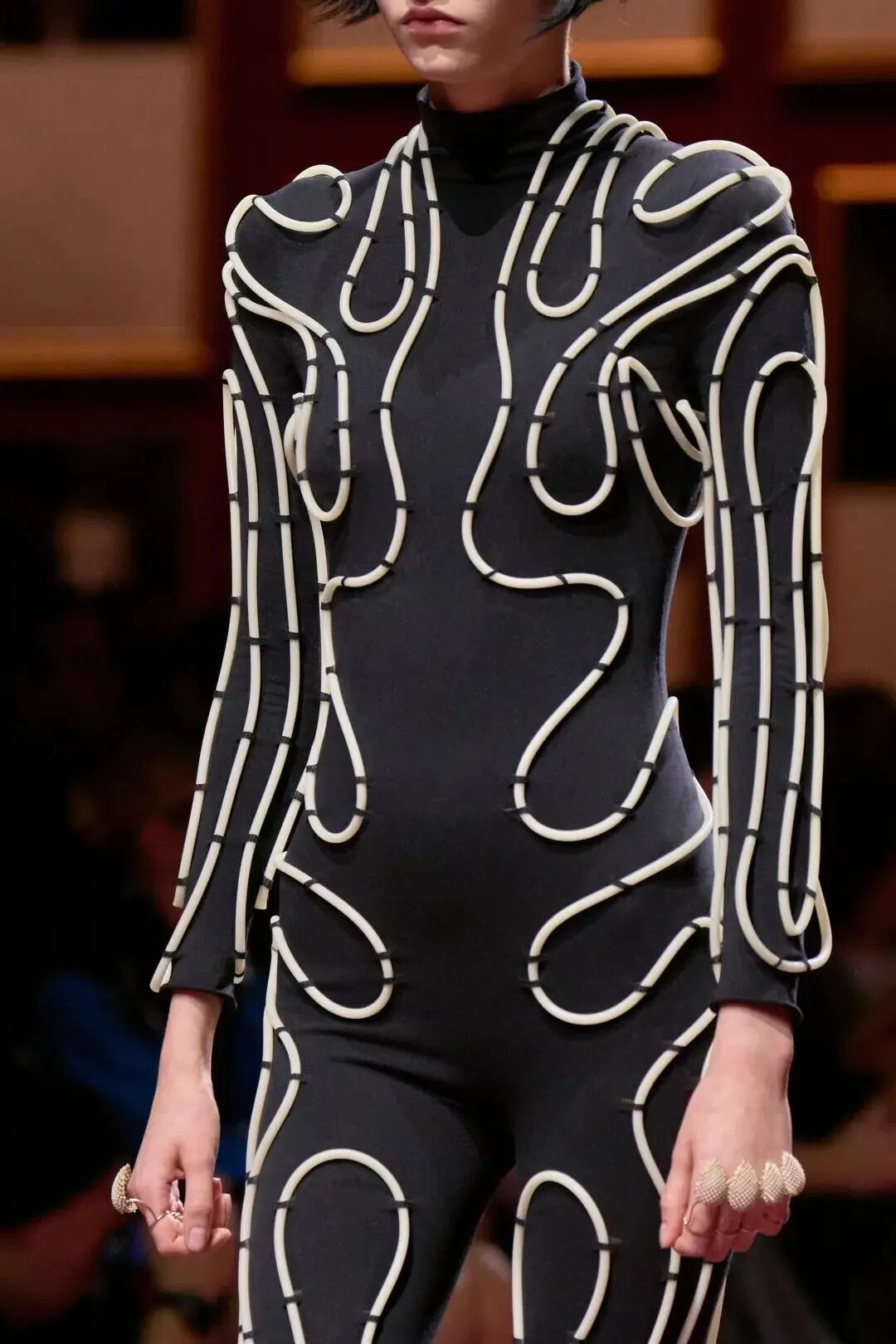今年3月初,Dior女装创意总监Maria Grazia Chiuri携手D-AIR实验室,为巴黎时装周注入科技新力量。发光紧身衣以恒温技术,呈现出静脉与动脉交织般的纹理,犹如一张纵横交错的有机网络。将套装的结构设计为可调节身体湿度且在必要时升温的智能系统,掀起兼具美学和实用的全新篇章。