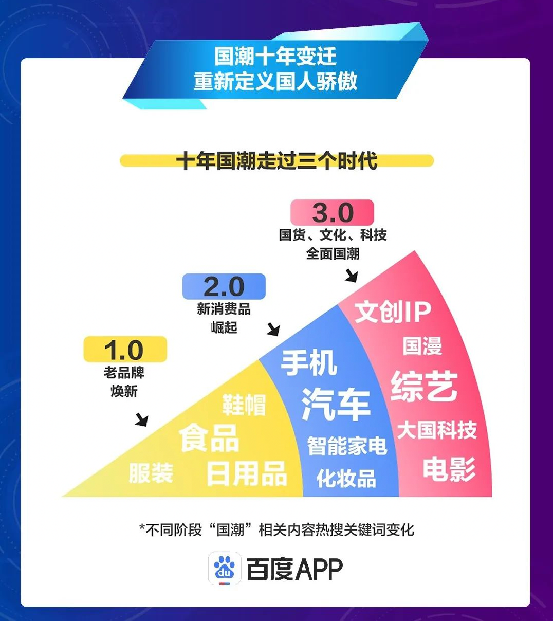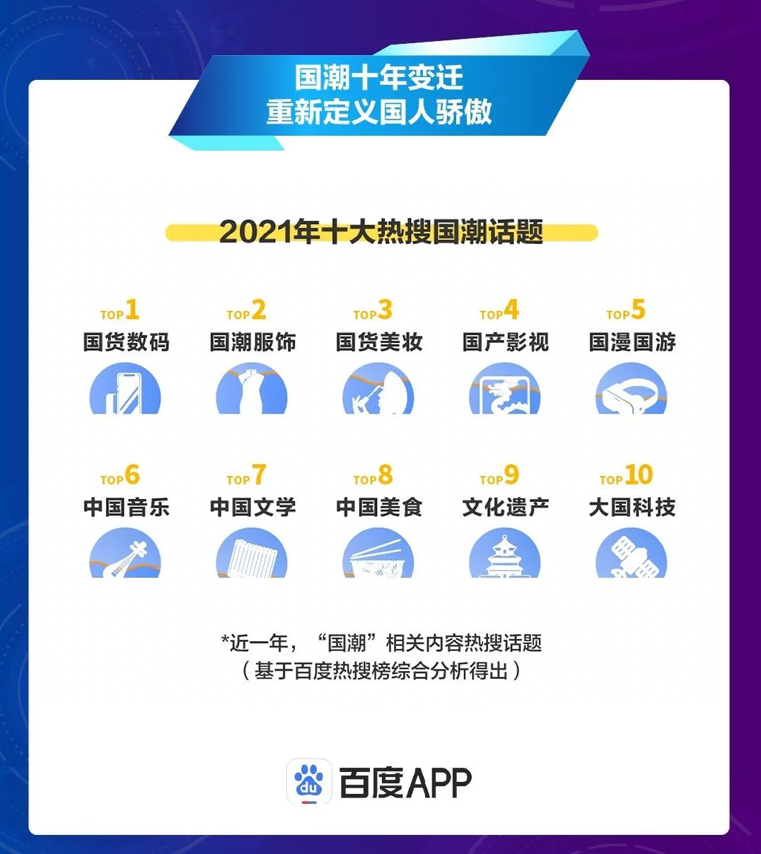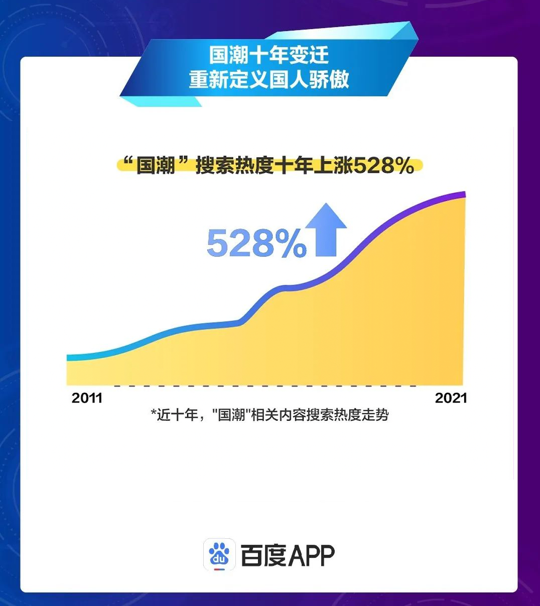 根据百度2021《国潮骄傲搜索大数据》报告显示,在过去十年里国潮的关注度上涨了528%,中国手机、汽车、美妆等热门行业的中国自主品牌的关注度更是全面反超海外品牌3倍。除此之外,国风综艺、国货美妆、国潮服饰、国货数码更是热度不减,而这些数据与现象都真实的反映出了当下国潮发展的新面貌、新趋势。