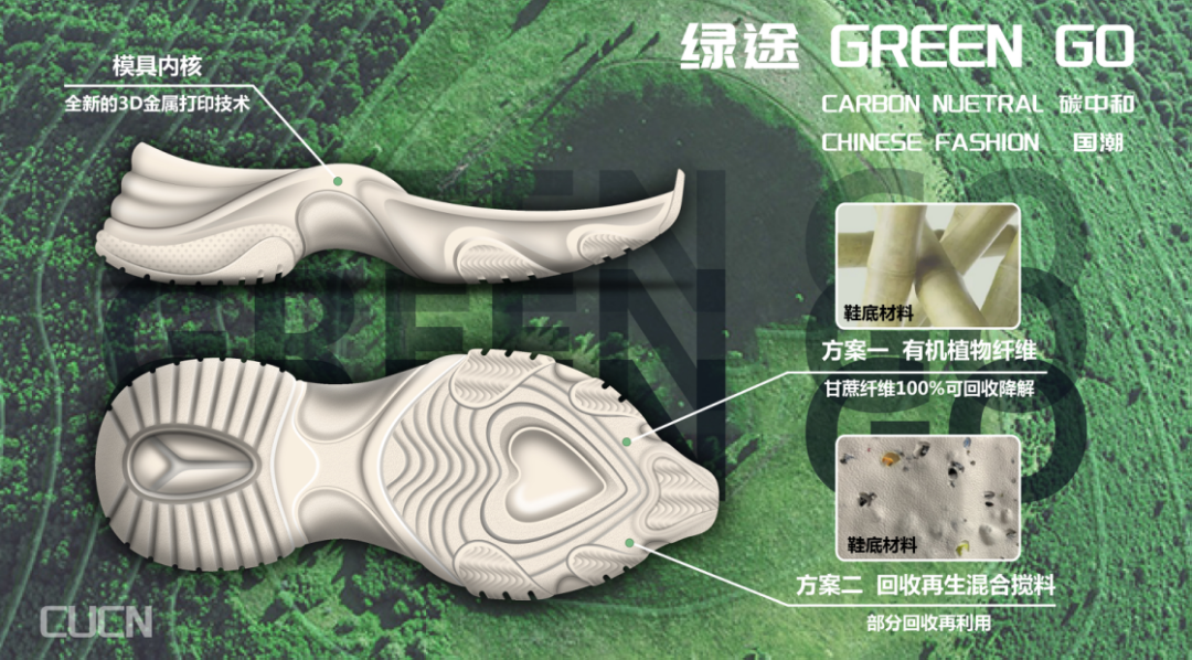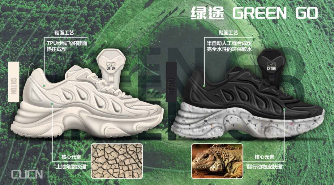 作为具备领先设计研发能力的品牌,绿途GreenGo从时下最具热度的趋势“国潮”汲取灵感,同时贴合当前国家“双碳”政策的题中之义,对产品进行研发和推广,为年轻的女性消费者设计一款时尚百搭,节能减碳的时尚运动潮鞋。