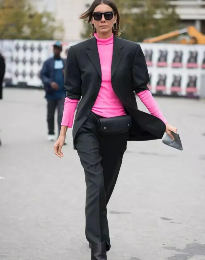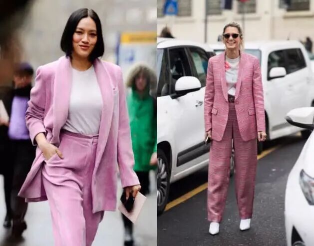 粉色套装在视觉感官上轻盈的很干净,搭配白色运动鞋,时髦又混搭。