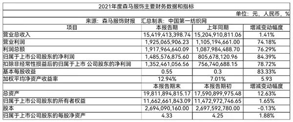 中国服装协会副会长单位——浙江森马服饰股份有限公司(以下简称“森马服饰”)3月9日晚间发布业绩快报,2021年,公司实现营业总收入154.19亿元,同比增长1.41%;净利润14.86亿元,同比增长84.39%。对于报告期内的业绩变动原因,森马服饰解释称,一是上年同期,公司经营业绩受到疫情和法国KIDILIZ集团亏损双重因素的影响,基数较低,财报显示,森马服饰于2020年9月初完成转让法国KIDILIZ集团,剔除法国KIDILIZ集团上年同期并表的亏损,2020