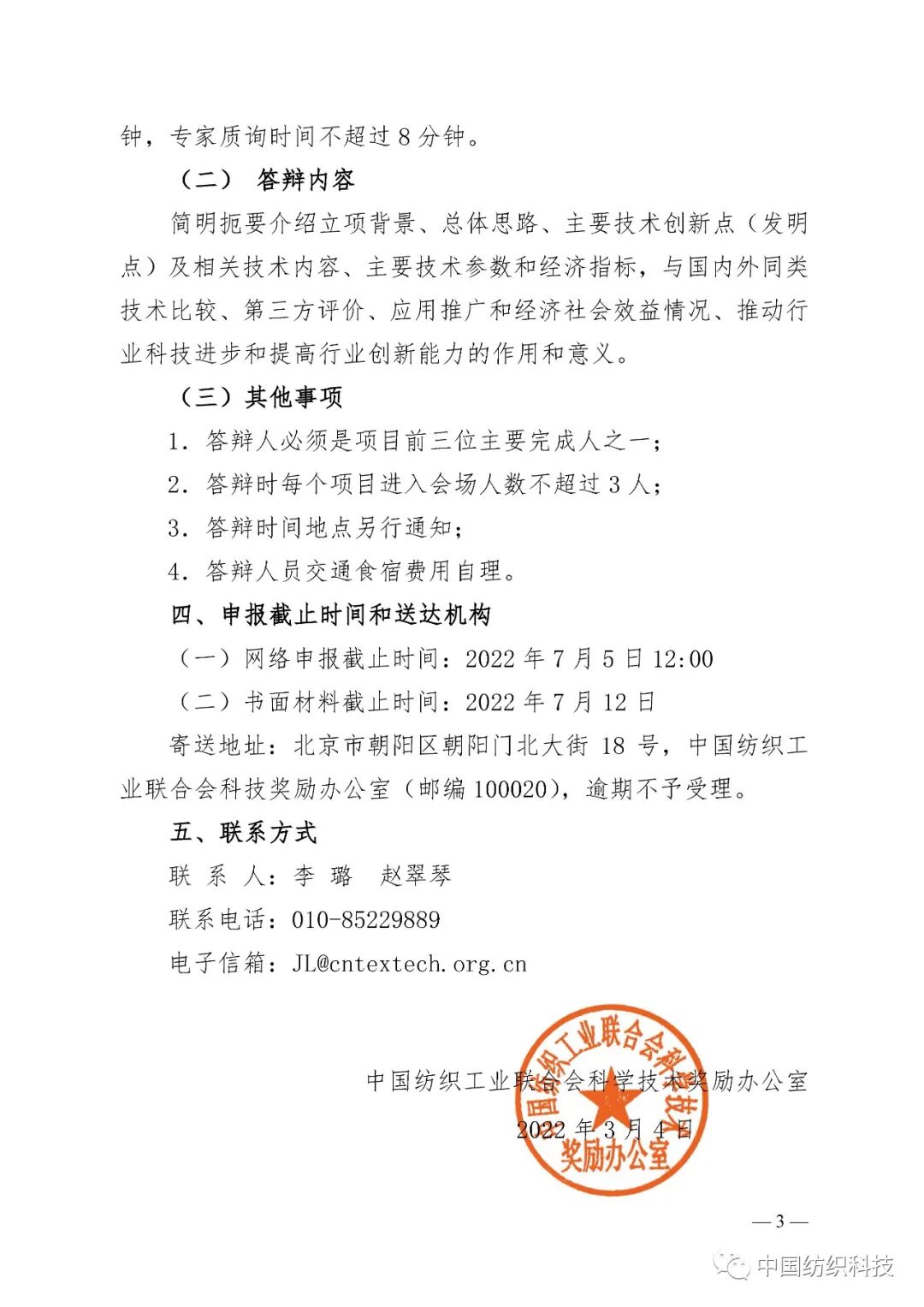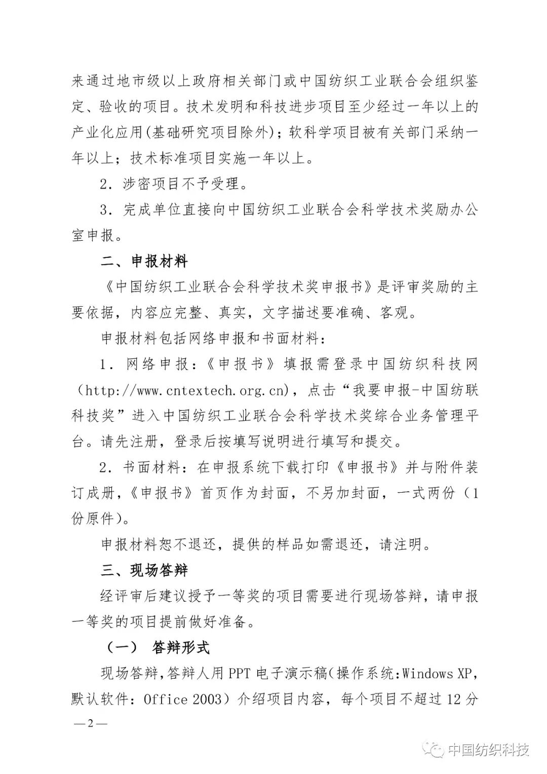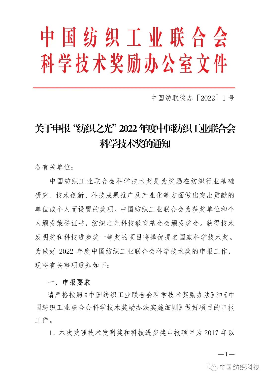 中国纺织工业联合会科学技术奖是为奖励在纺织行业基础研究、技术创新、科技成果推广及产业化等方面做出突出贡献的单位或个人而设置的奖项。中国纺织工业联合会为获奖单位和个人颁发荣誉证书,纺织之光科技教育基金会办法奖金。获得技术发明奖和科技进步奖一等奖的项目将择优提名国家科学技术奖。2022年度中国纺织工业联合会科学技术奖的申报工作已经正式启动,具体通知如下。