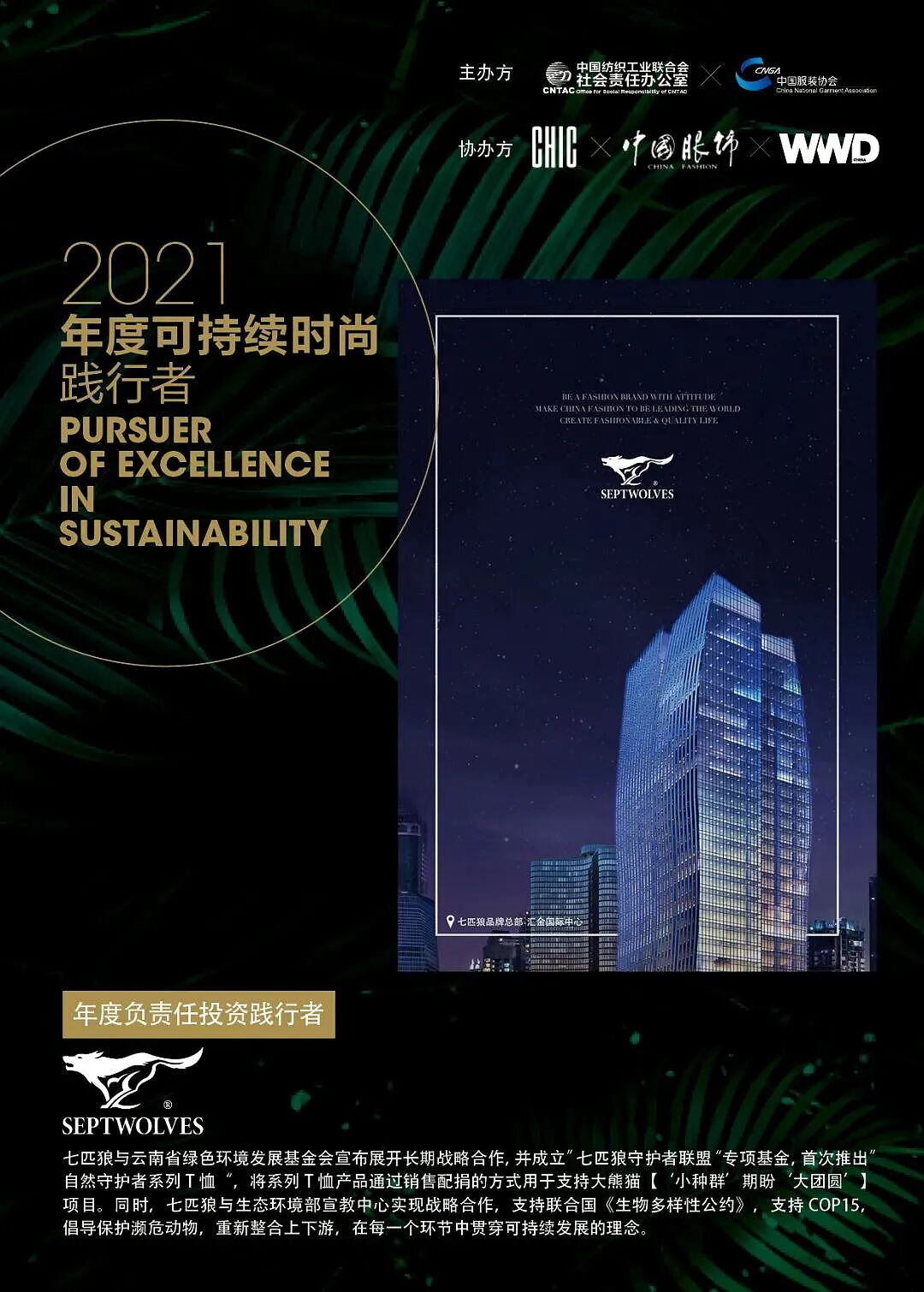 各大服装企业勇担社会责任,以精湛先进的工艺,将科技环保面料运用到产品中,加大智能制造的投入,从生产端注重绿色节能,贯彻可持续发展理念。本期关注年度负责任投资践行者——福建七匹狼实业股份有限公司。