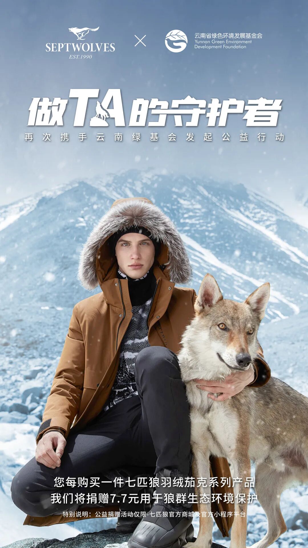 作为一家有社会责任担当的国民品牌,七匹狼与公益机构合作展开生物多样性保护计划。七匹狼与云南省绿色环境发展基金会宣布展开长期战略合作,并成立“七匹狼守护者联盟”专项基金,首次推出“自然守护者系列T恤”,将系列T恤产品通过销售配捐的方式用于支持大熊猫【‘小种群’期盼‘大团圆’】项目。