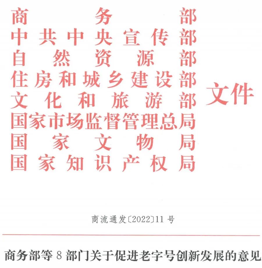 为促进老字号持续健康高质量发展,更好满足人民美好生活需要,近日,商务部、中共中央宣传部、自然资源部、住房和城乡建设部、文化和旅游部、国家市场监督管理总局、国家文物局、国家知识产权局联合印发了《商务部等8部门关于促进老字号创新发展的意见》(以下简称《意见》)。