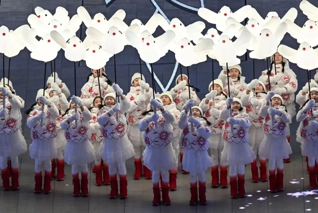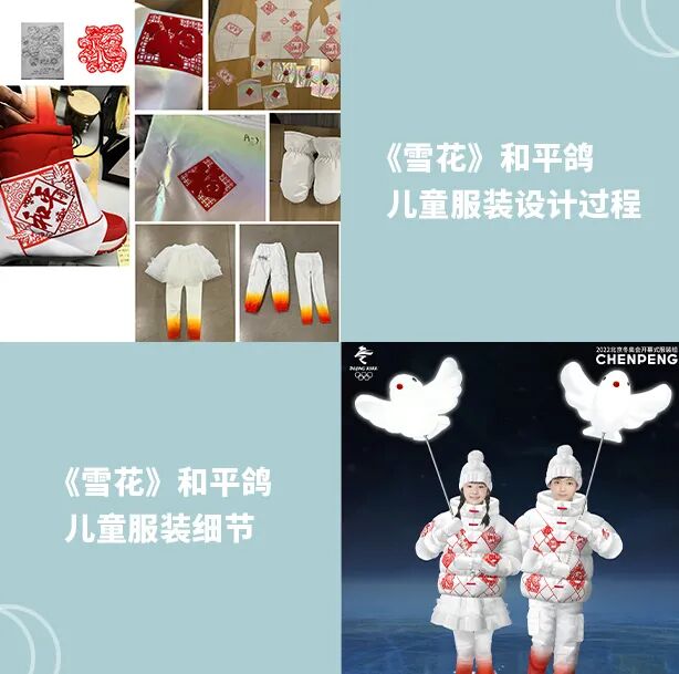 以中国原创设计师陈鹏为冬奥开幕式的《雪花》和平鸽儿童服装为例,融入河北蔚县剪纸文化,由河北非遗剪纸文化传承人任志国和孙清明根据冬奥元素特别创作,CHENPENG STUDIO 以时装设计的创意对非遗作品进行二次创作,结合中国古代门窗结构把剪纸图形重组,从而形成最终版的“新中式窗花”图形;而在国际奥组委主席巴赫讲话环节,各国国旗举起手服装则以冬奥会主视觉《千里江山图》绿色版本设计方案在众多设计中胜出,在运动、时尚、简约、干净明了的设计风格中传递平等友爱的理念。