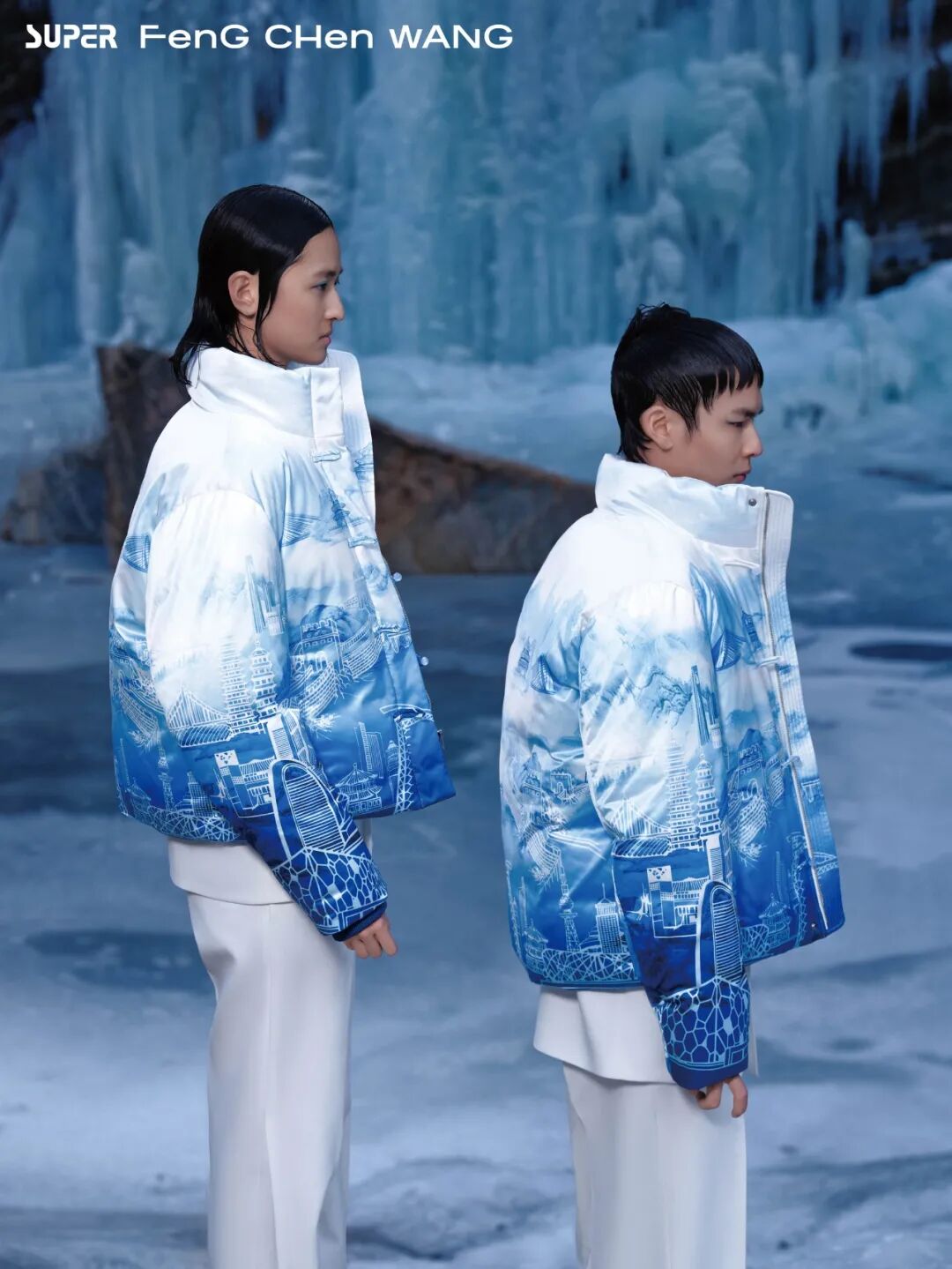 同样是以《千里江山图》为灵感,中国先锋设计师品牌 Feng Chen Wang 的设计师王逢陈则在开幕式奥林匹克会旗护旗手的全套服装中以中国传统的山水国画元素作为背景,远近虚实的韵律感,以当代的设计语言表达国之韵律,在外套上运用渐变的色彩晕染,结合线描手法的艺术形式,绘制具有代表性的中国历史建筑和奥运会标志性建筑,表达出同一世界下人与自然、人与世界间的相融与相连。