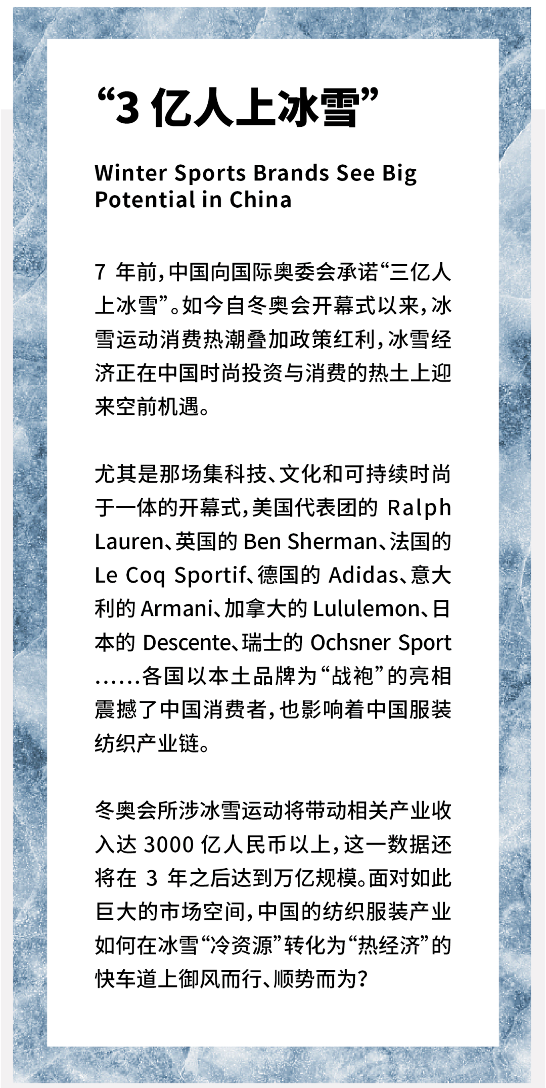 旧的时代结束,新的时代开启。虽然,中国冰雪运动服装装备企业依然在冰雪文化的普及度和核心技术的掌控度方面有待提升,但在看得见的冬奥会赛场上和看不见的押注冬奥的资本市场上,世界服装令中国观众瞩目,中国服装的创意、技术和理念也正在被世界看到。