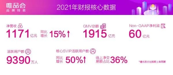 2月23日,特卖电商唯品会披露了未经审计的2021年第四季度和全年财务业绩。受益于活跃用户数增长的推动,2021年全年总收入同比(较上年同期)增长14.9%至1171亿元。非美国通用会计准则下2021年净利润为60亿元,同比下降4.76%。
