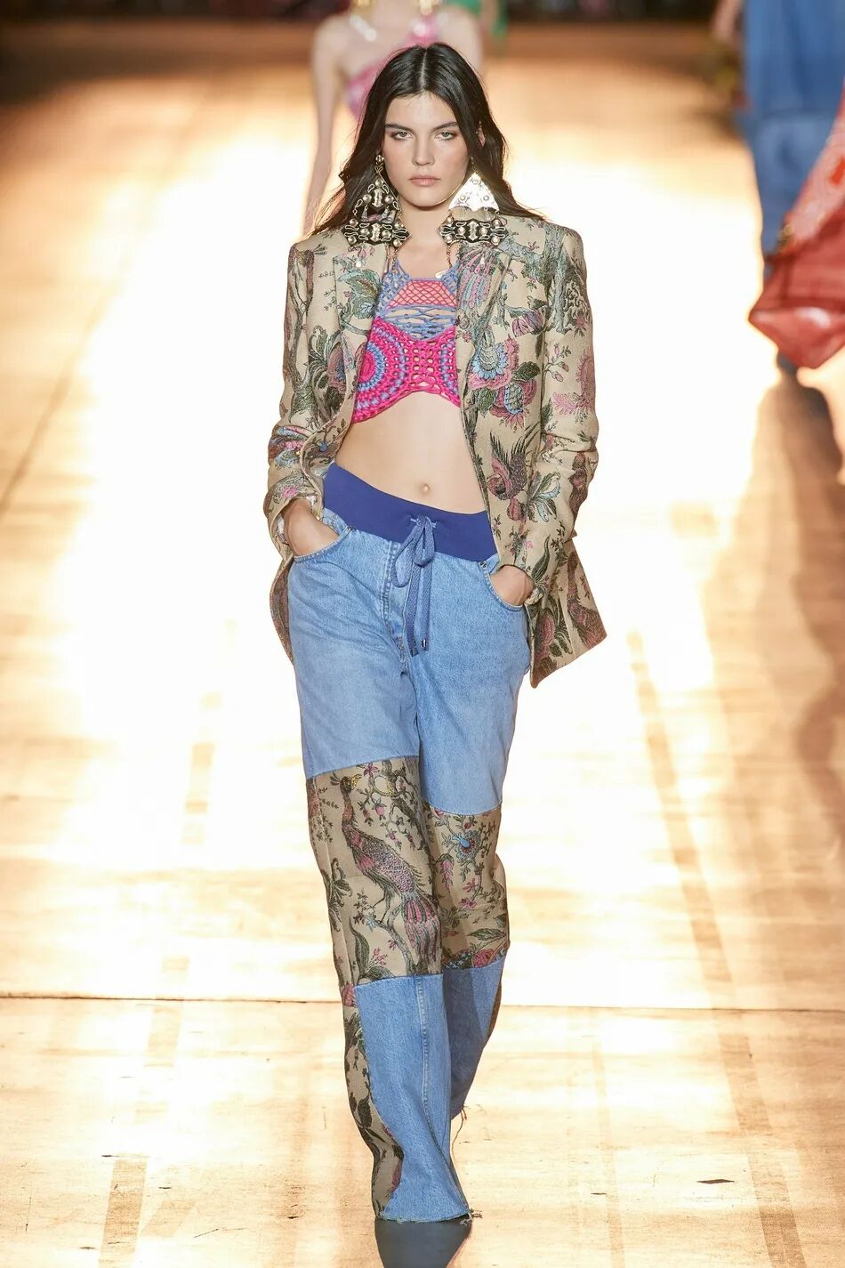 Veronica Etro将低腰牛仔裤与几何线条造型融合,紧身露肤的上衣与松垮的低腰裤,造型不因图案的色彩明艳而繁重,给90年代的怀旧奢华风格赋予异域风情。