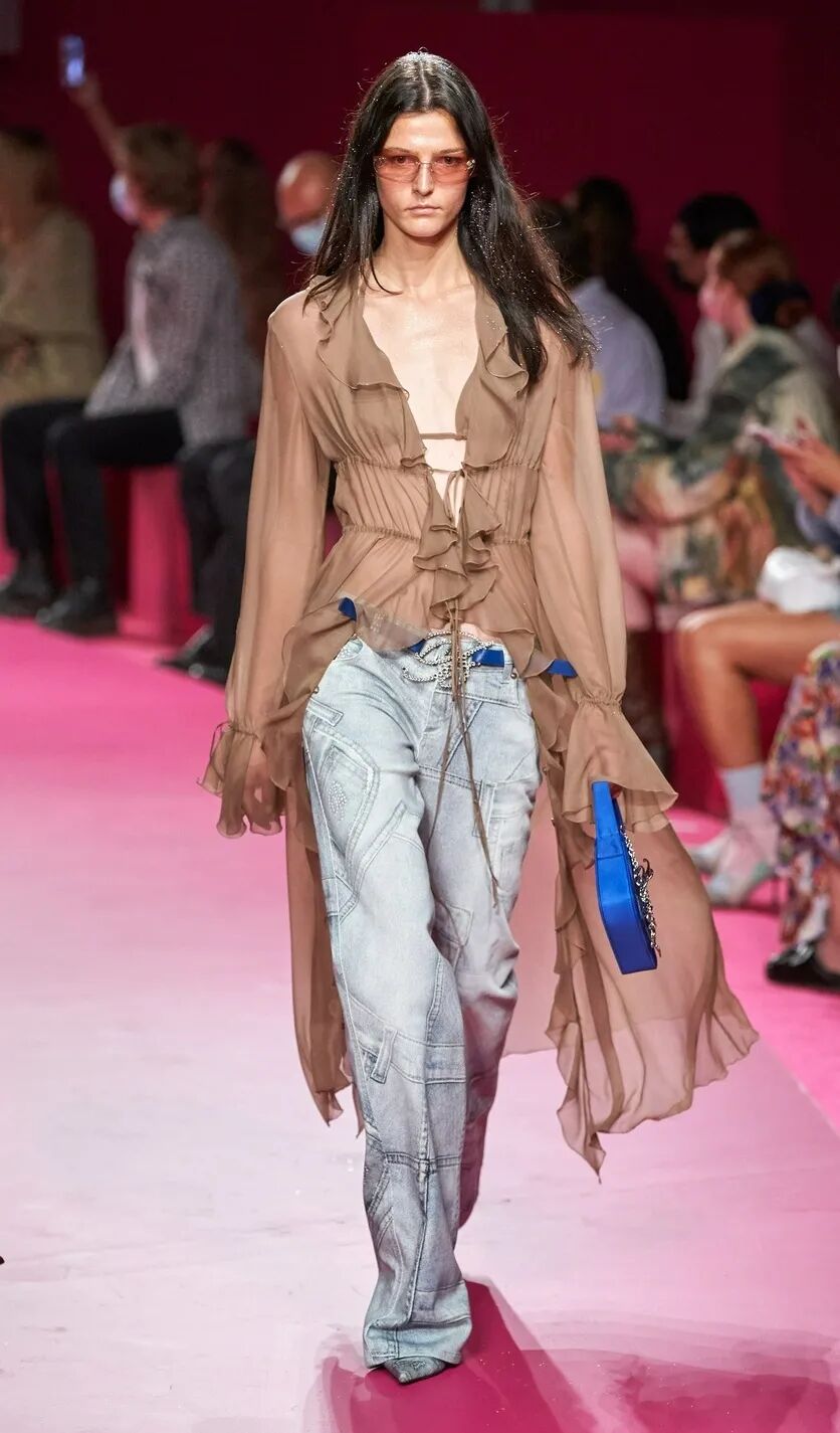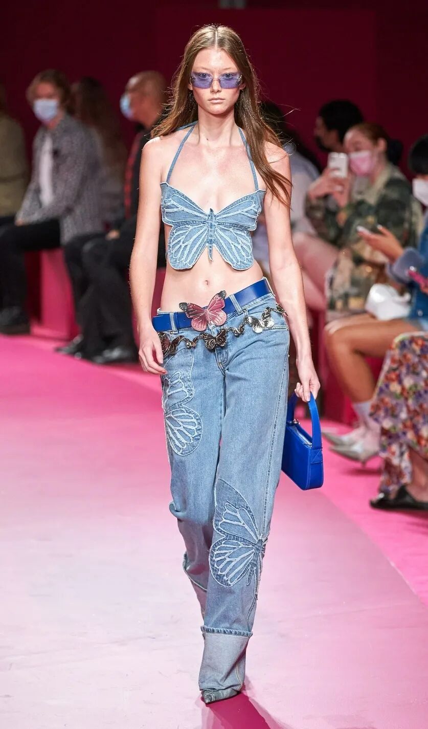 Blumarine的2022春夏新品把人们瞬间带回了20年前,将极具标志性的低腰牛仔、充满复古味的造型投掷在时尚圈舞台上。