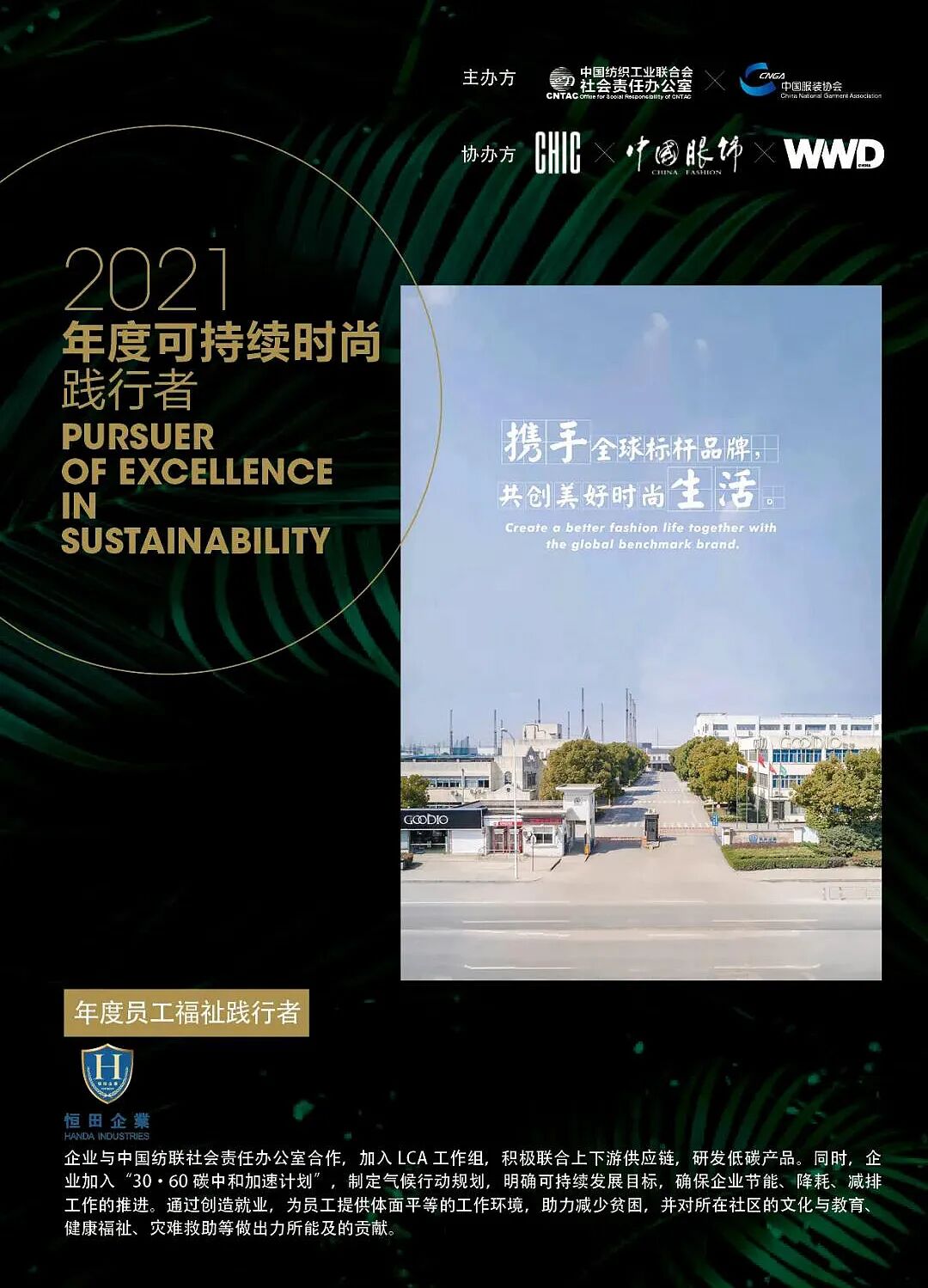 中国第二届《可持续时尚践行者名录》由主办方中国纺织工业联合会社会责任办公室、中国服装协会,和协办方中国国际服装服饰博览会CHIC、中国服装协会会刊《中国服饰》及WWD China共同发起,以致敬、表彰那些在可持续时尚领域砥砺前行,以超卓远见、优异领导力和卓越成就激励同行者的优秀企业。