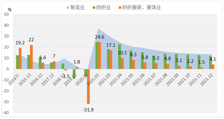 受国内疫情反复、极端天气等因素影响,国内消费市场复苏进程受到一定影响,销售和投资增速均有所放缓,总体呈现弱复苏的态势。根据国家统计局数据, 12月,我国社会消费品零售额增速仅为1.7%,1-12月,社会消费品零售额同比增长12.5%,两年平均增速为3.9%,低于2019年同期增速4.1个百分点;同期,固定资产投资额(不含农户)同比增长4.9%,两年平均增速为3.9%,低于2019年同期增速1.5个百分点;12月,制造业采购经理指数(PMI)中的新订单指数已经连续五个月位于收缩区间,反映出市场需求总体偏弱。四季度,我国人均居民收入和人均消费支出同比分别增长8.1%和12.6%,增速分别比上半年放缓3.9和4.8个百分点。其中,四季度人均衣着消费支出1419元,同比增长14.6%,增速比上半年放缓6.8个百分点。