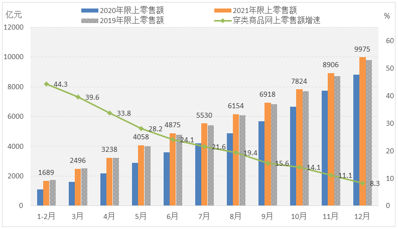 12月,在促消费政策逐步显效、节日消费等因素的带动下,我国服装市场销售明显改善,限额以上单位服装类商品零售额降幅持续收窄,线上消费对内需市场拉动作用持续凸显。根据国家统计局数据,1-12月,我国限额以上单位服装类商品零售额累计9974.6亿元,同比增长14.2%,两年平均增长2.4%,仍低于2019年同期增速0.2个百分点;12月限额以上单位服装类商品零售额同比下降1.1%,降幅比8月收窄6.5个百分点。同期,线上服装零售保持较快增长,穿类商品网上零售额同比增长8.3%,增速比上年同期提高2.5个百分点,两年平均增长7.0%,仍低于2019年同期增速8.4个百分点。