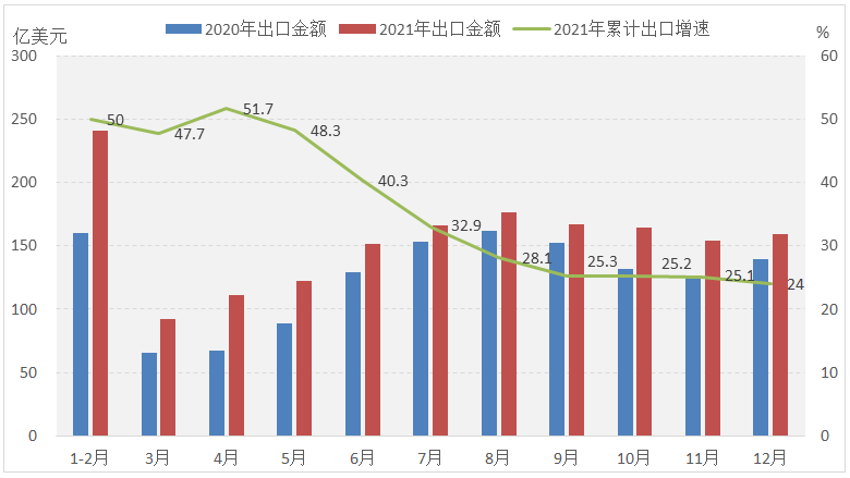 2021年以来,我国服装出口企业克服了物流不畅、运费飙升、原材料价格上涨等诸多困难,表现出强大的发展韧性,服装出口保持较快增长,创2016年以来同期服装出口规模的最高纪录。根据中国海关数据,1-12月,我国累计完成服装及衣着附件出口1702.63亿美元,同比增长24%,两年平均增长7.7%;在国际市场需求增加、节日促销的拉动下,12月当月服装出口增速虽有所放缓,但仍保持了14.5%的两位数增长。其中,针织服装及衣着附件出口增势强劲,出口金额为864.72亿美元,同比增长38.96%,两年平均增长10.09%;机织服装及衣着附件出口保持稳定增长,出口金额为701.15亿美元,同比增长12.59%,两年平均增长2.56%。