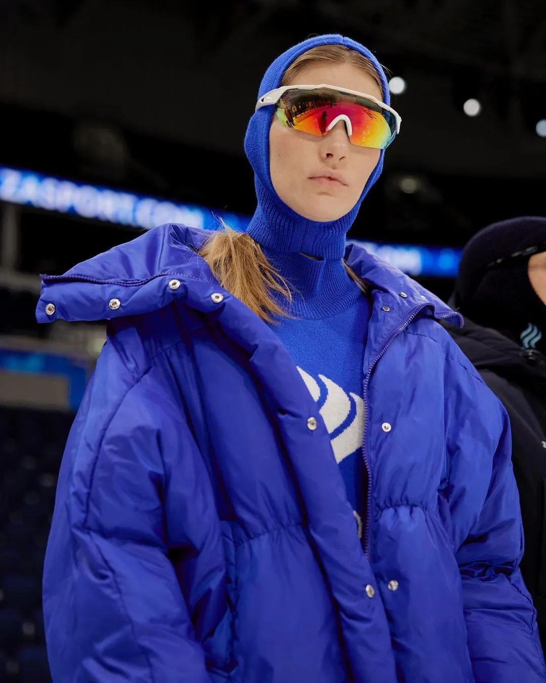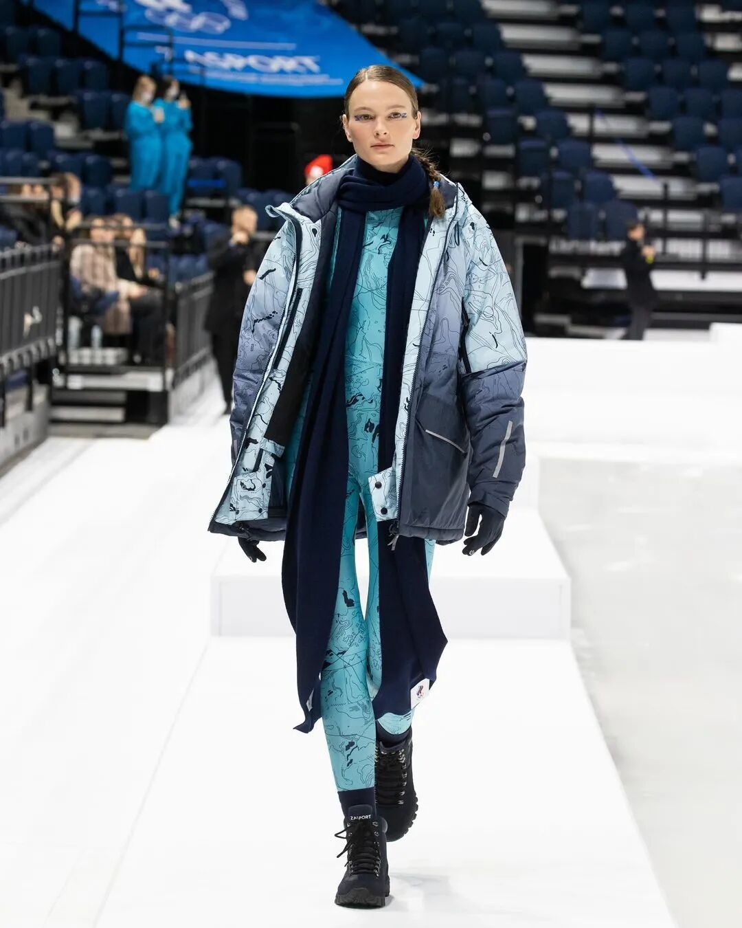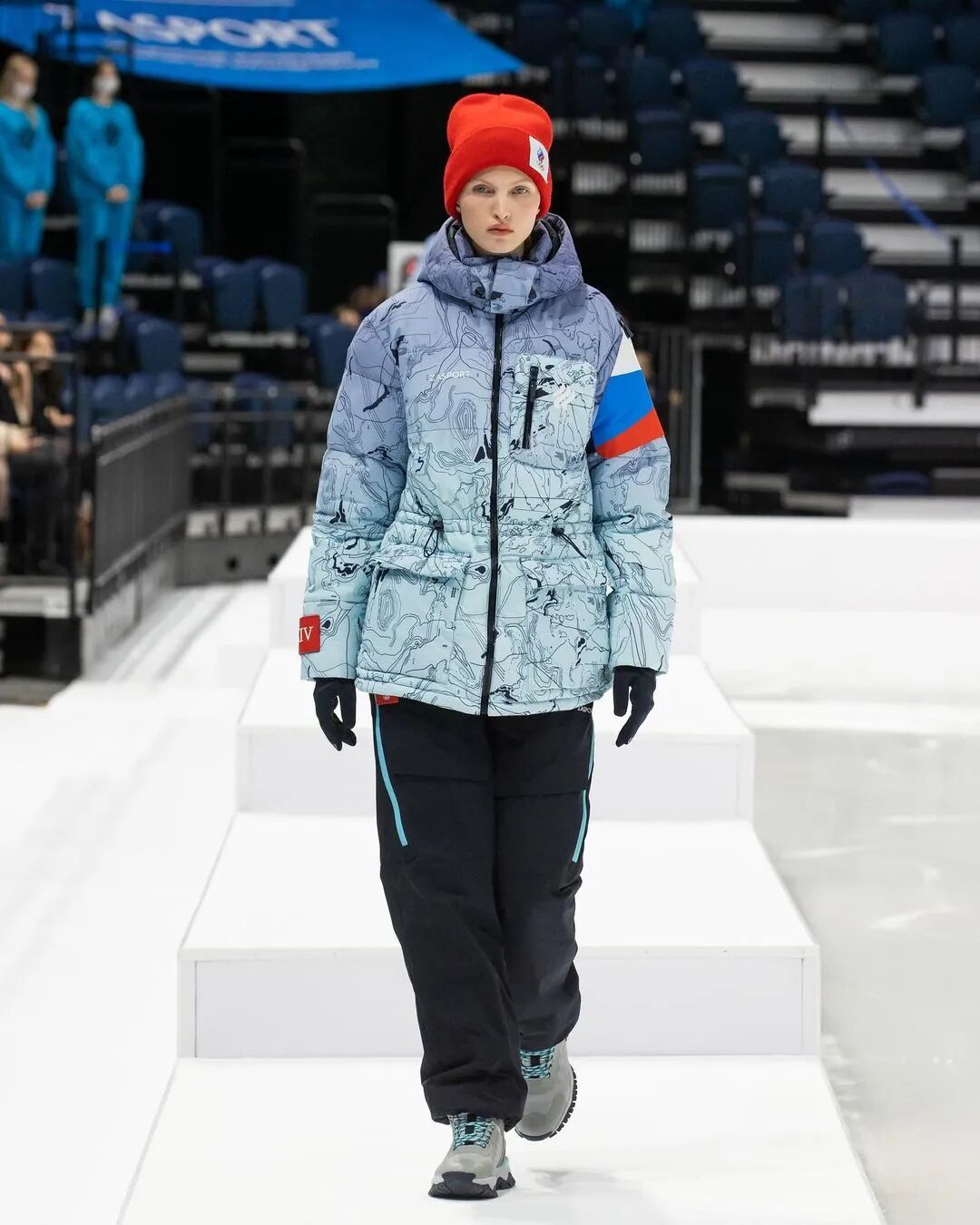 但是,这并不影响设计师完成令人惊艳的设计!羽绒夹克的底纹是俄罗斯国家地理拼图,从中可以看到包括索契海岸线、贝加尔湖等多个自然地标;袖子上白蓝红三色不规则条纹巧妙地呈现了俄罗斯国旗,长袖卫衣上的龙形底纹充满了中国元素。小编一时分不清这到底是秀场还是赛场啦!来源:一行一线