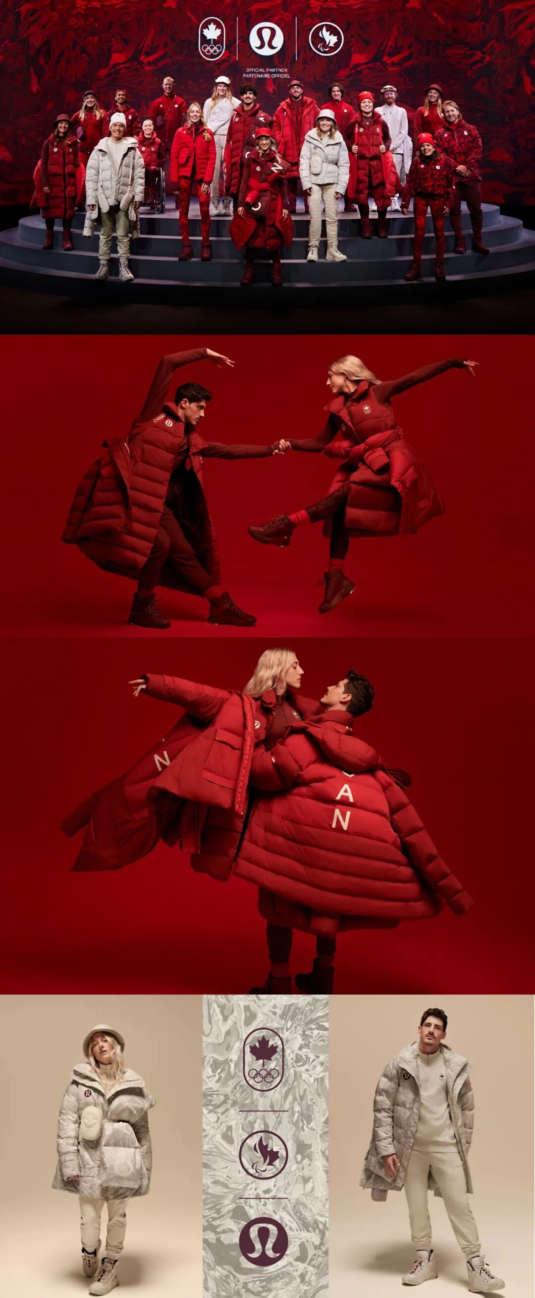 闭幕式服装则为男女同款,包括水牛格子连帽羽绒服、羊毛裤和男女装紧身裤,以及手套、靴子等单品,均采用可持续材料打造,羽绒服、靴子和手套使用再生聚酯纤维,而高领衫和帽子则采用经过认证的美国产羊毛制成。不愧是有着50多年历史的时装品牌,Ralph Lauren这一波堪称是达到了时尚设计、实用功能与尖端科技的完美平衡。不少人只知道lululemon是以瑜伽服起家的运动品牌,但却不一定了解它起源于加拿大,并且人家做起户外服饰来也是杠杠的!本次与加拿大奥委会达成合作的lululemon,为本国冬奥代表团带来了两套开闭幕式的服装造型。率先在开幕式公开的服装以红色为主基调,上装为派克大衣,配有背带方便在温度较高时携带,下装有带印花和不带印花的两种运动长裤可选。