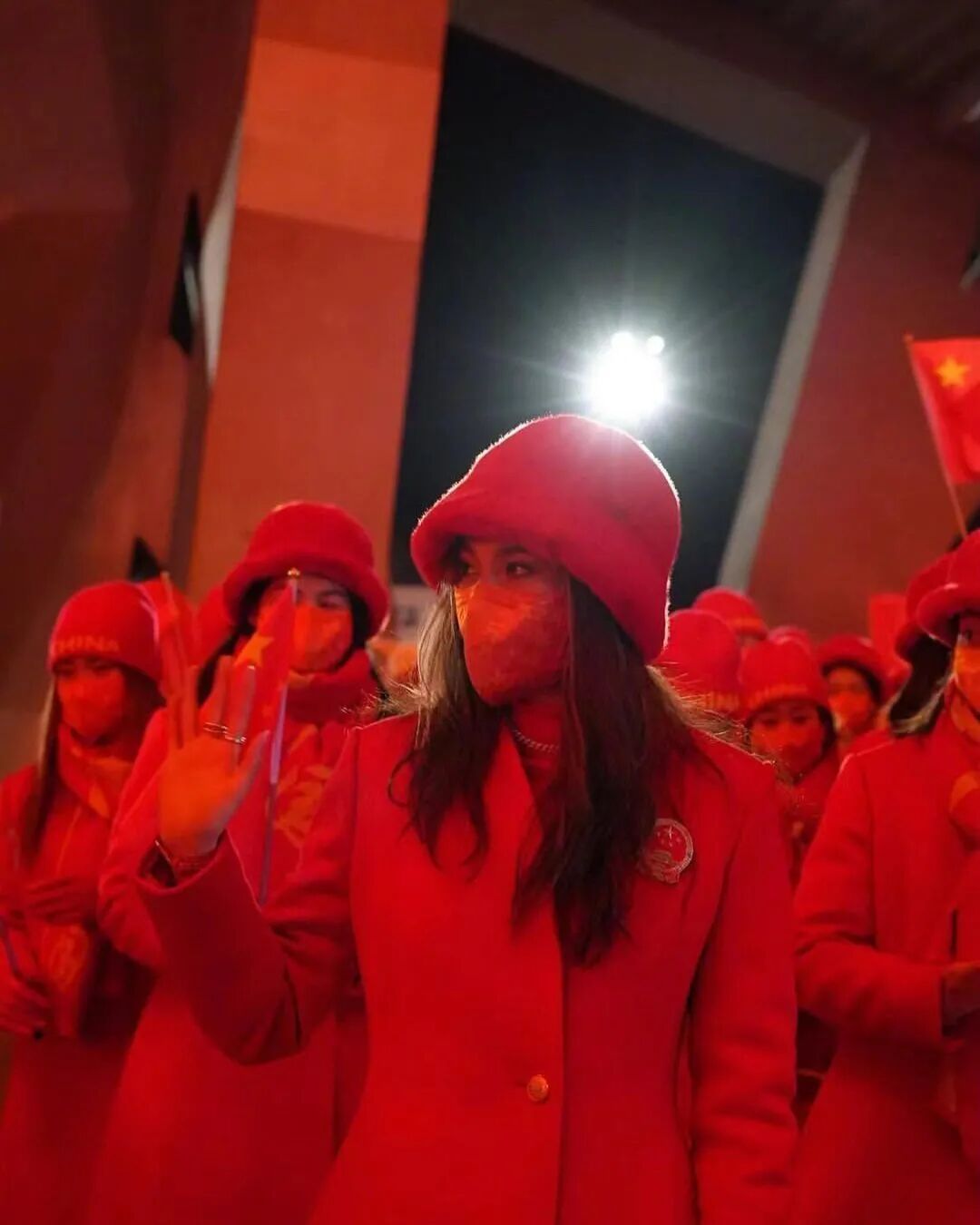 中国人的浪漫还得是中国红!中国体育代表团387人身着由北京服装学院设计团队设计、山东迪尚集团制造的礼仪服饰参加本届开幕式入场仪式。钢架雪车女将赵丹、速度滑冰名将高亭宇担任中国代表团开幕式旗手
