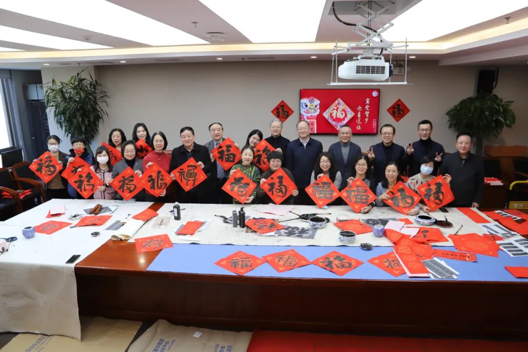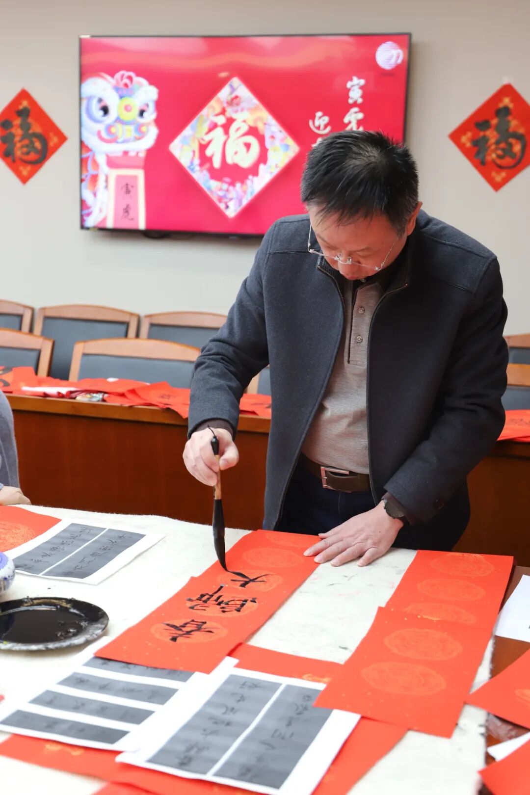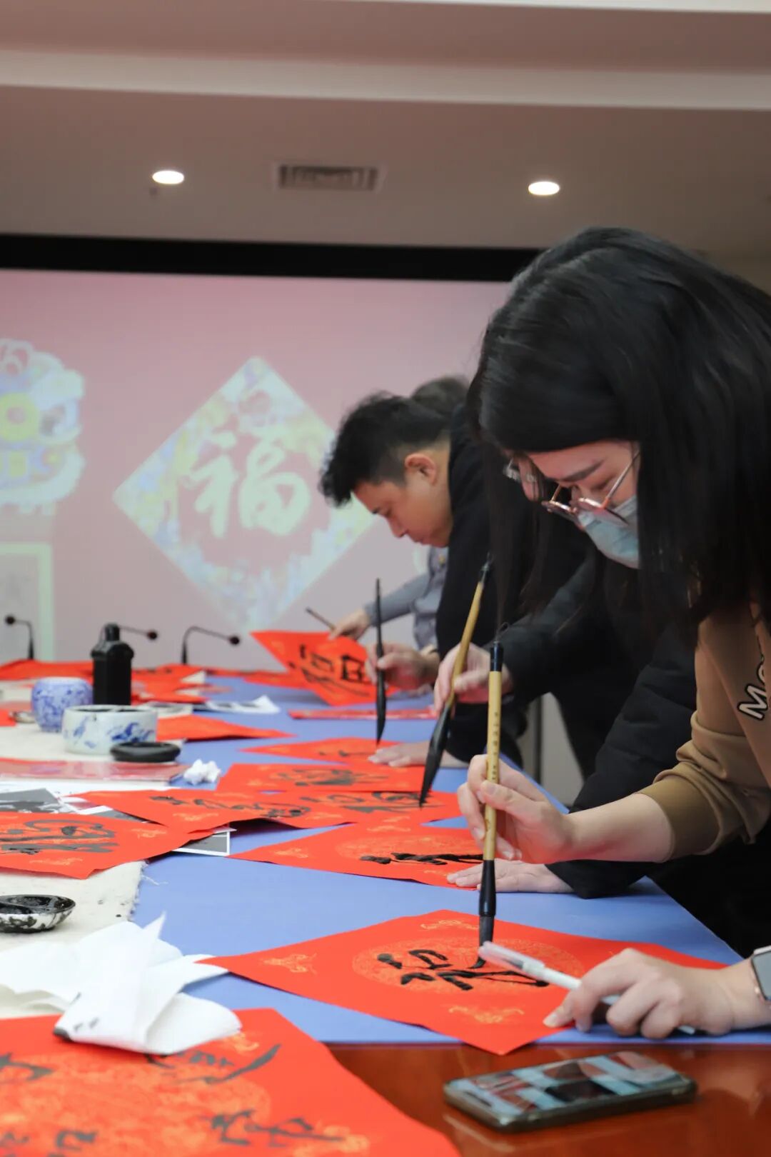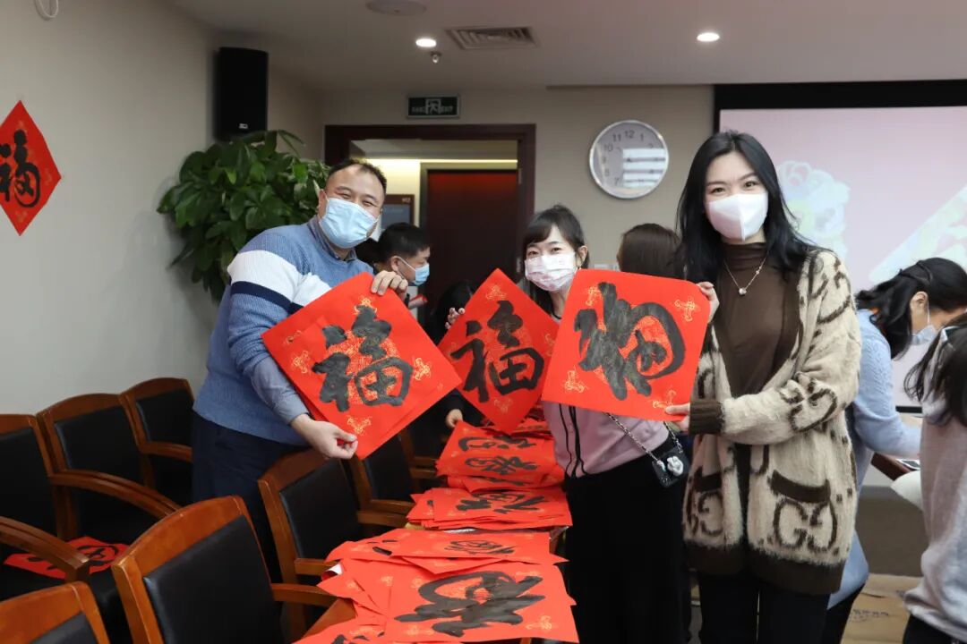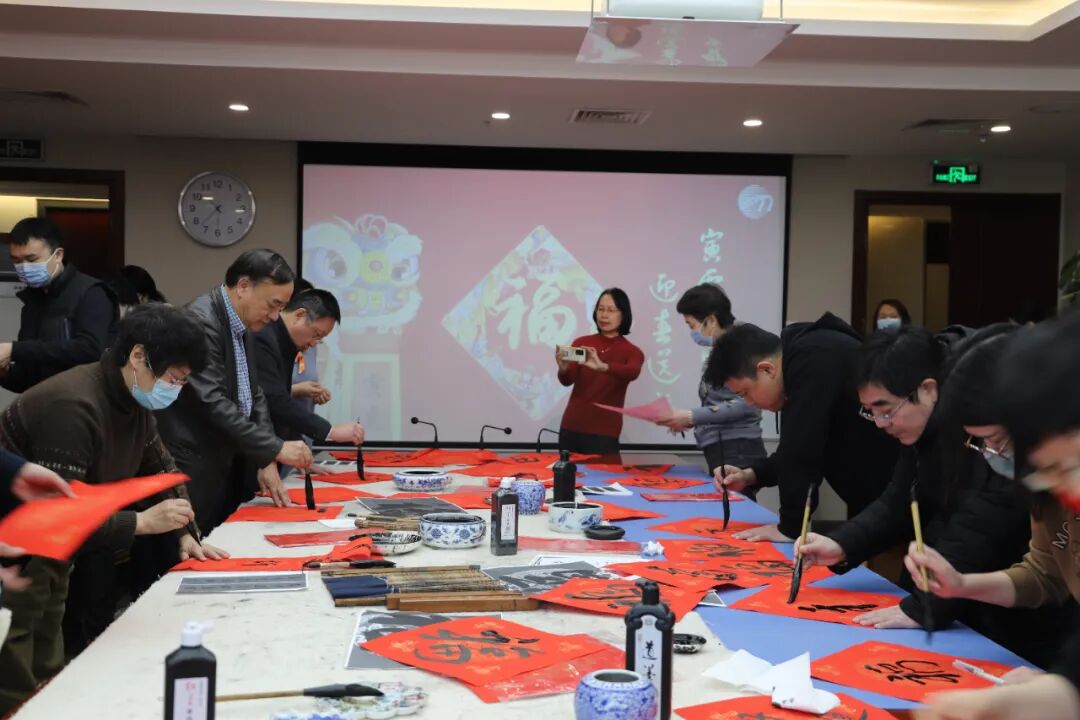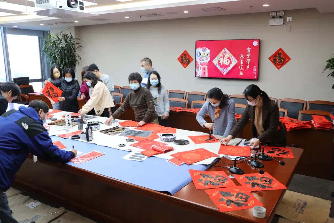 中国纺联人保办公区第一会议室翰墨飘香,红福溢彩,熠熠生辉。真、草、隶、篆、行五体书法的福字,对仗工整、寓意吉祥的楹联彰显着中国纺联“联合舰队”大家庭的团结与活力,活动现场阵阵的欢声笑语传递着喜庆的节日气氛。在热烈的气氛中,开始了“点福送福”环节,领导们手持毛笔,点福写福,将活动推向高潮。一幅幅福字、一对对春联,代表着中国纺联领导、工会、书画社同仁对中国纺联全体员工的新春祝福,祝大家在新的一年里身体健康、事业有成、家庭幸福,祝纺织行业战胜疫情、虎虎有生气!作为中国纺联一年一度的文化建设品牌活动,本次活动由中国纺联工会和中国纺联书画联谊社联合举办,旨在即将迎来壬寅春节的美好时刻,深入贯彻以习近平同志为核心的党中央一系列重要决策部署,推动中国纺联文化建设,继续发扬中国纺联“联合舰队”精神,激励中国纺联广大干部职工振奋精神、守正创新、勇毅前行,以饱满的热情投入到建设纺织行业“十四五”高质量发展的火热实践中,以优异的成绩迎接党的二十大胜利召开。