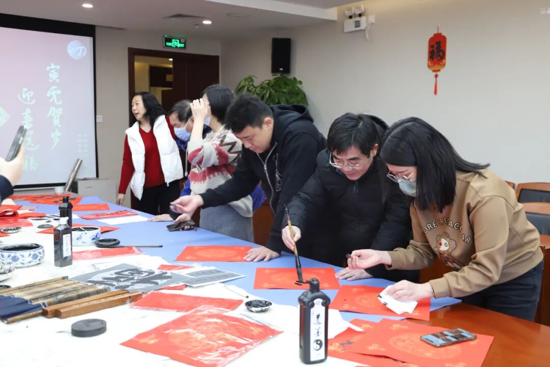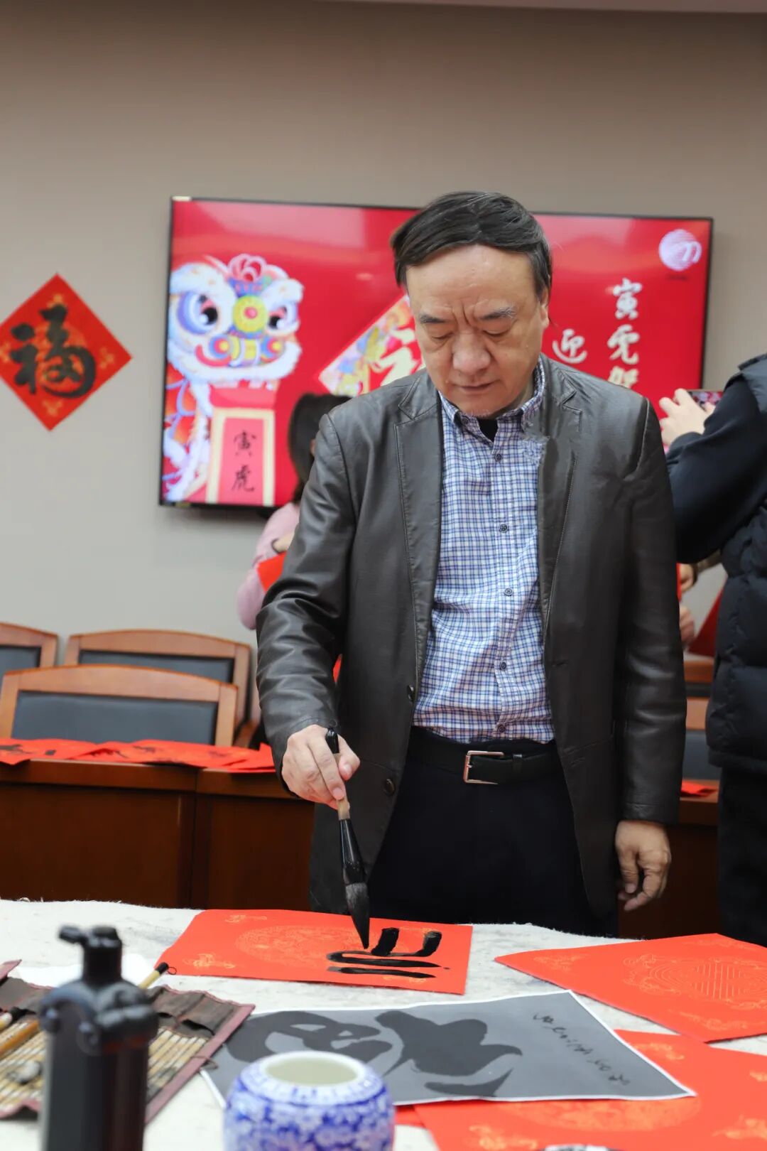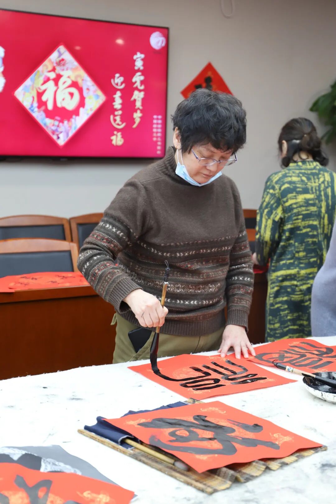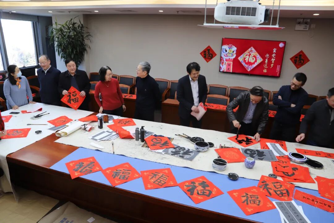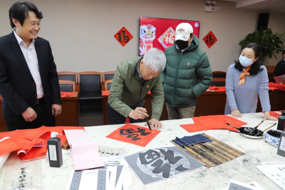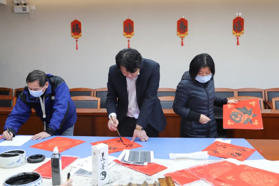 中国纺联人保办公区第一会议室翰墨飘香,红福溢彩,熠熠生辉。真、草、隶、篆、行五体书法的福字,对仗工整、寓意吉祥的楹联彰显着中国纺联“联合舰队”大家庭的团结与活力,活动现场阵阵的欢声笑语传递着喜庆的节日气氛。在热烈的气氛中,开始了“点福送福”环节,领导们手持毛笔,点福写福,将活动推向高潮。一幅幅福字、一对对春联,代表着中国纺联领导、工会、书画社同仁对中国纺联全体员工的新春祝福,祝大家在新的一年里身体健康、事业有成、家庭幸福,祝纺织行业战胜疫情、虎虎有生气!作为中国纺联一年一度的文化建设品牌活动,本次活动由中国纺联工会和中国纺联书画联谊社联合举办,旨在即将迎来壬寅春节的美好时刻,深入贯彻以习近平同志为核心的党中央一系列重要决策部署,推动中国纺联文化建设,继续发扬中国纺联“联合舰队”精神,激励中国纺联广大干部职工振奋精神、守正创新、勇毅前行,以饱满的热情投入到建设纺织行业“十四五”高质量发展的火热实践中,以优异的成绩迎接党的二十大胜利召开。