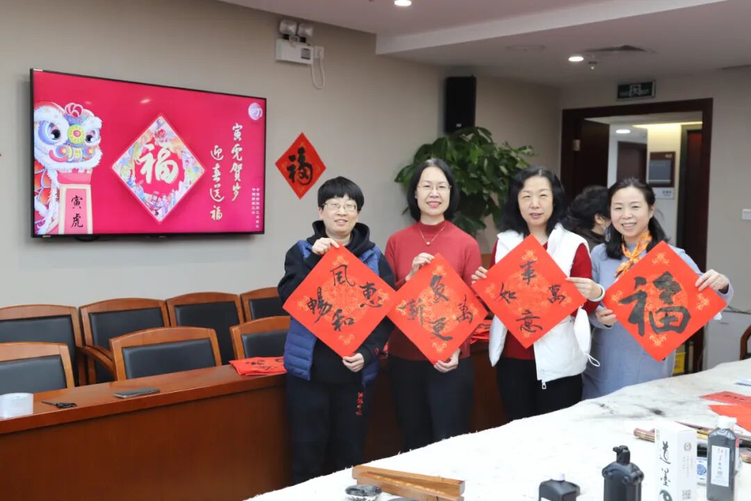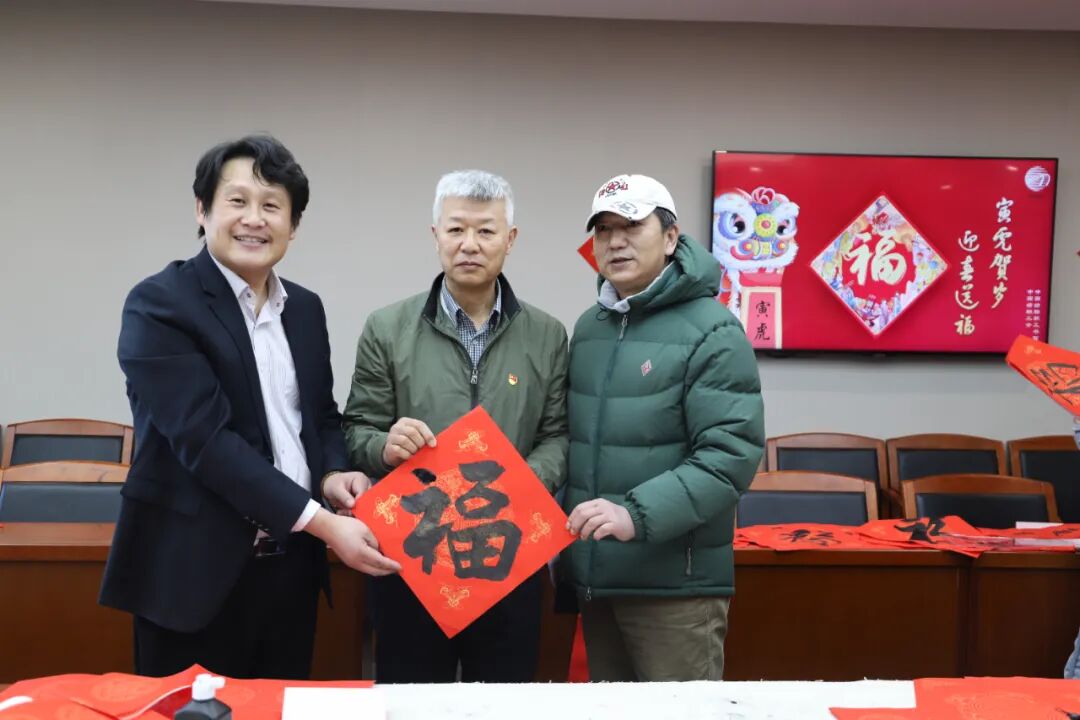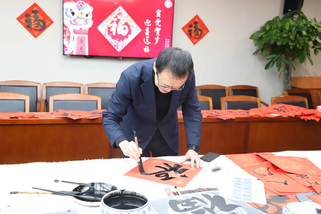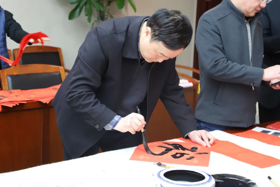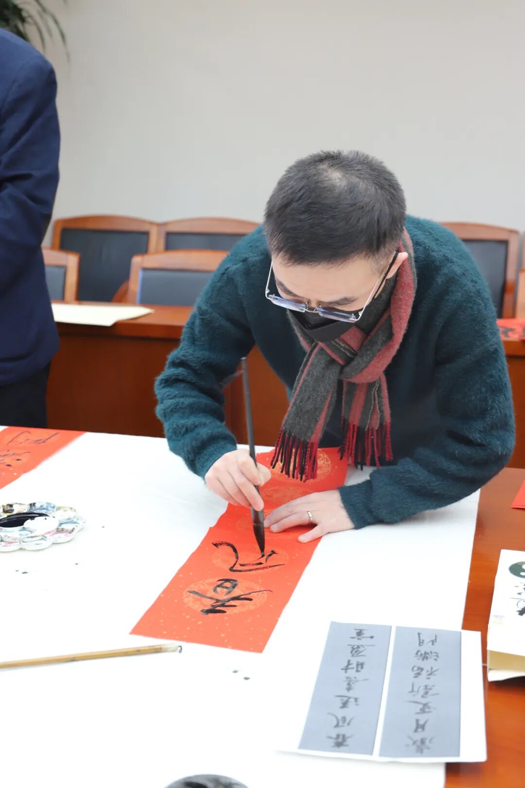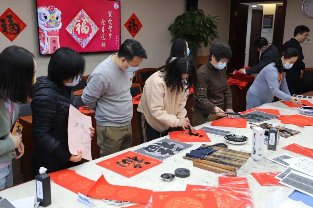 中国纺联人保办公区第一会议室翰墨飘香,红福溢彩,熠熠生辉。真、草、隶、篆、行五体书法的福字,对仗工整、寓意吉祥的楹联彰显着中国纺联“联合舰队”大家庭的团结与活力,活动现场阵阵的欢声笑语传递着喜庆的节日气氛。在热烈的气氛中,开始了“点福送福”环节,领导们手持毛笔,点福写福,将活动推向高潮。一幅幅福字、一对对春联,代表着中国纺联领导、工会、书画社同仁对中国纺联全体员工的新春祝福,祝大家在新的一年里身体健康、事业有成、家庭幸福,祝纺织行业战胜疫情、虎虎有生气!作为中国纺联一年一度的文化建设品牌活动,本次活动由中国纺联工会和中国纺联书画联谊社联合举办,旨在即将迎来壬寅春节的美好时刻,深入贯彻以习近平同志为核心的党中央一系列重要决策部署,推动中国纺联文化建设,继续发扬中国纺联“联合舰队”精神,激励中国纺联广大干部职工振奋精神、守正创新、勇毅前行,以饱满的热情投入到建设纺织行业“十四五”高质量发展的火热实践中,以优异的成绩迎接党的二十大胜利召开。