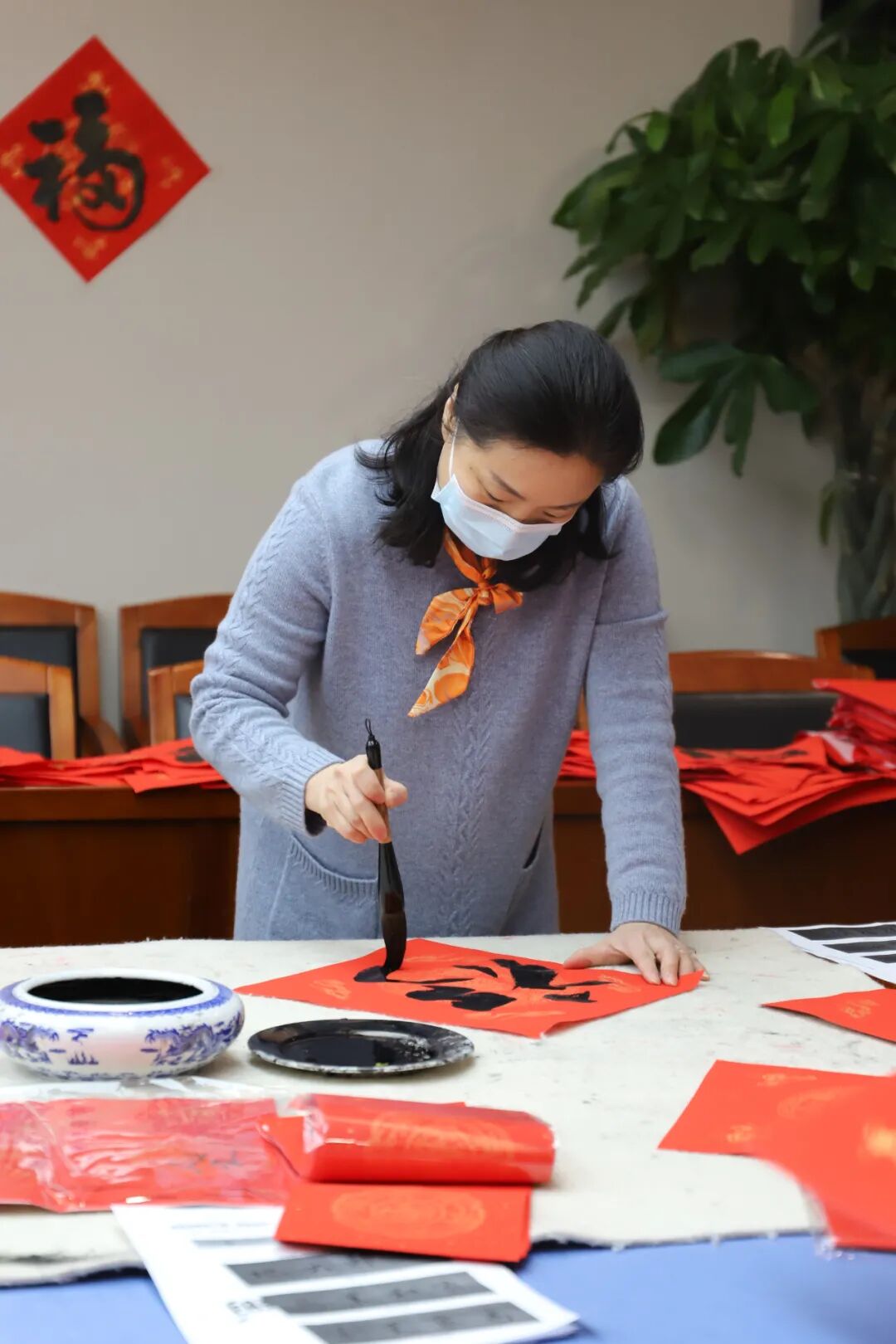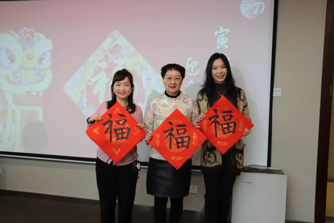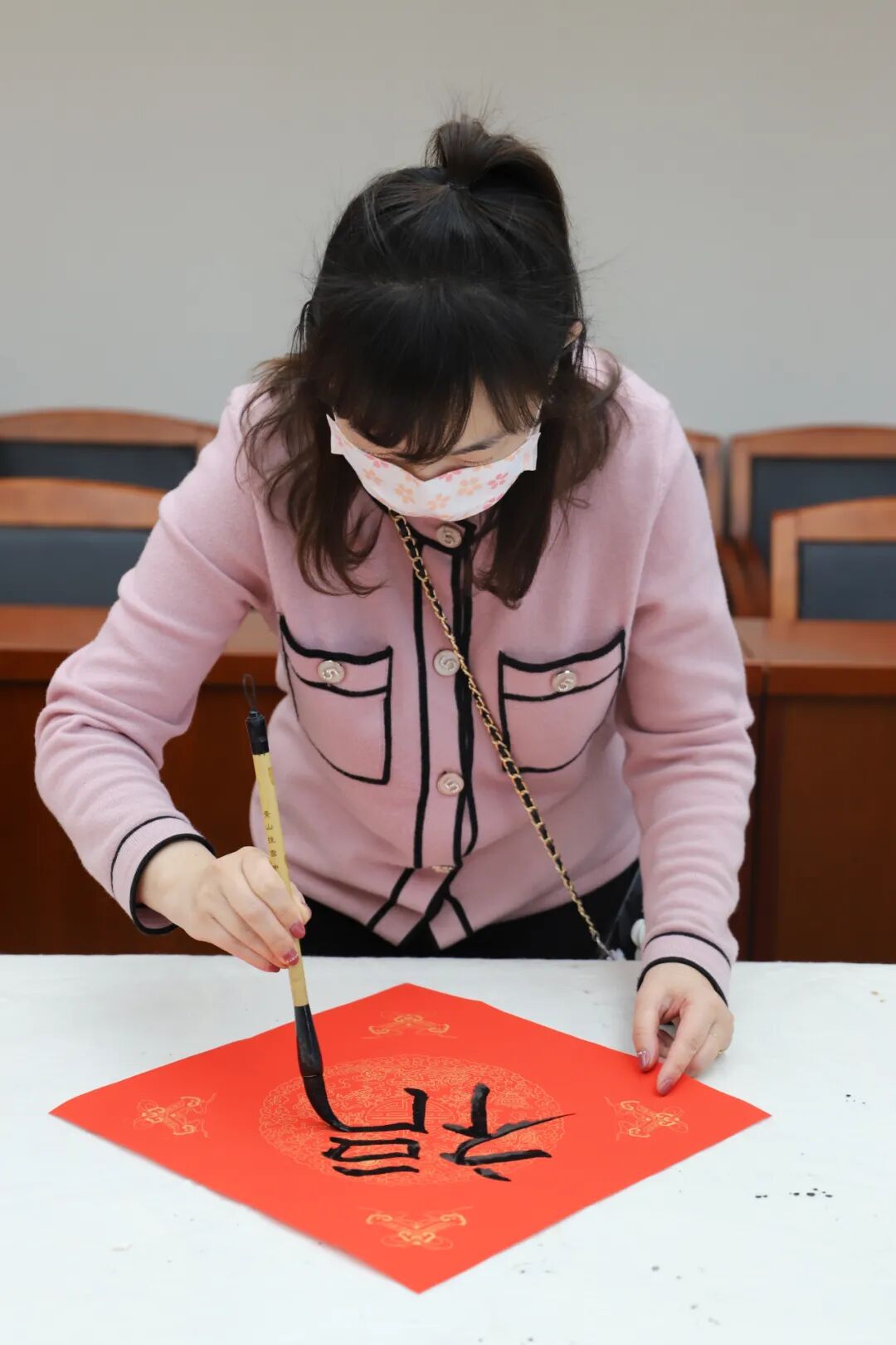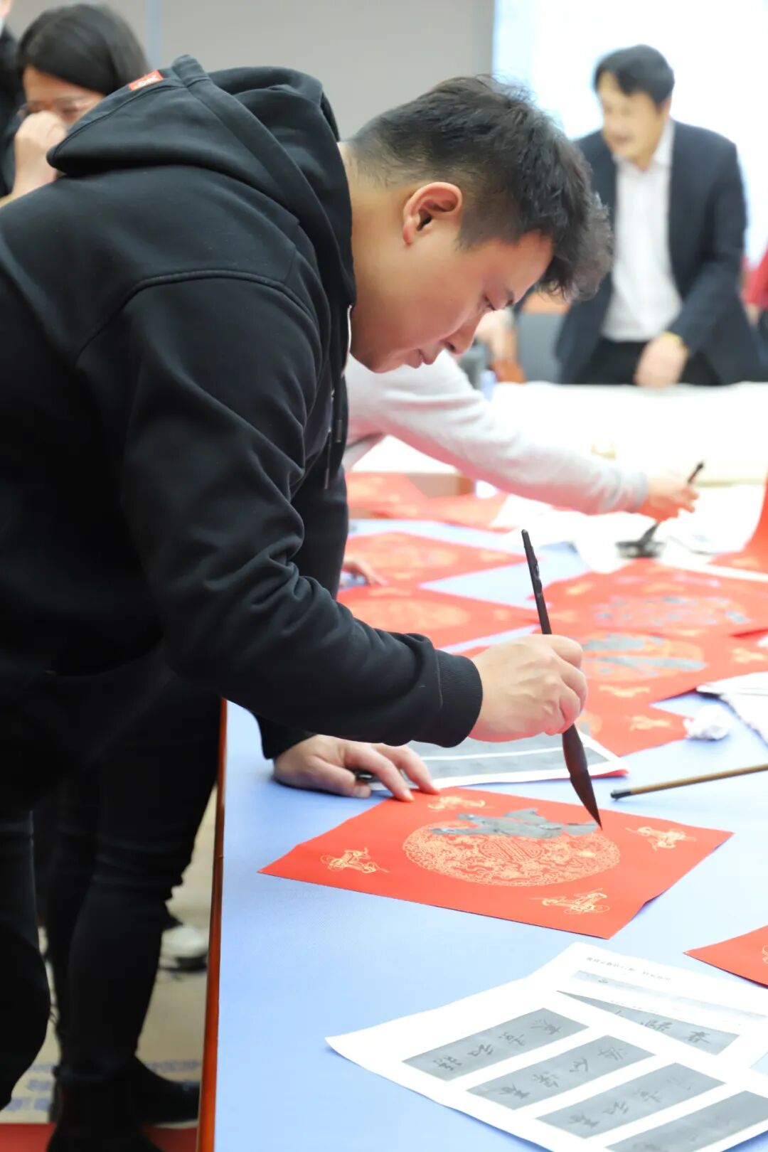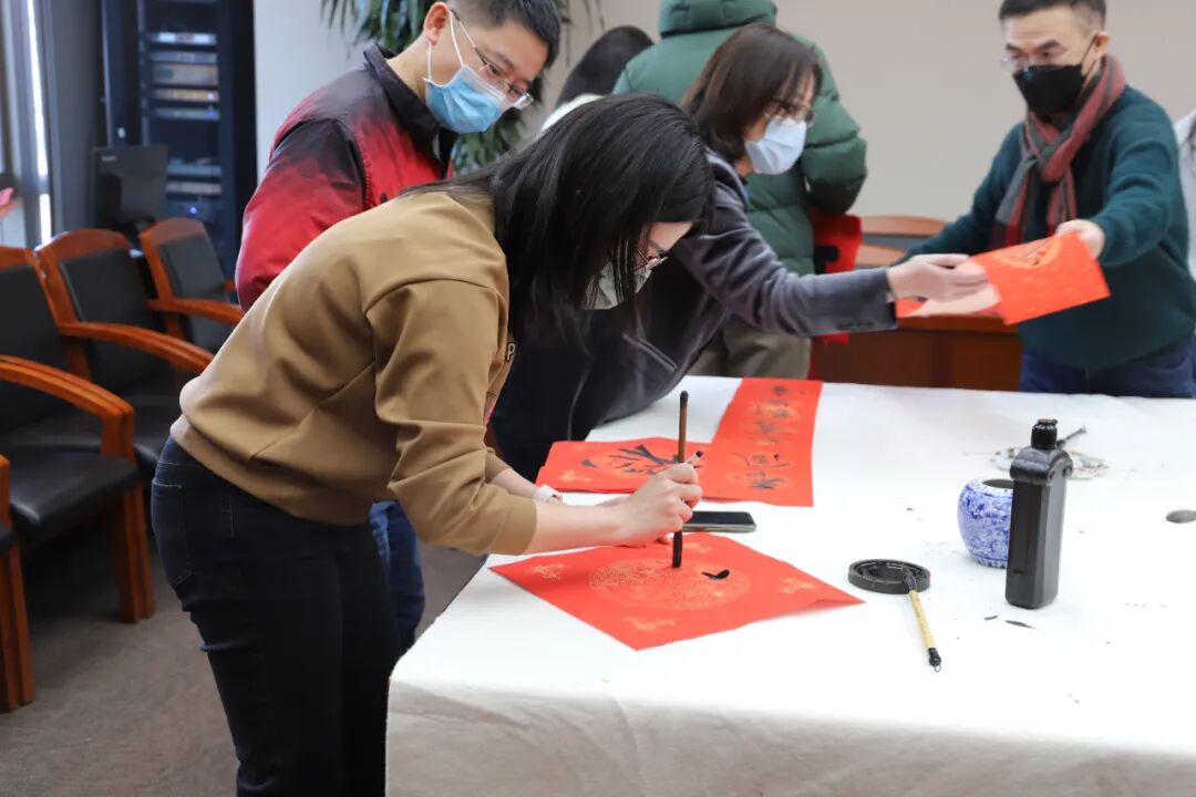 中国纺联人保办公区第一会议室翰墨飘香,红福溢彩,熠熠生辉。真、草、隶、篆、行五体书法的福字,对仗工整、寓意吉祥的楹联彰显着中国纺联“联合舰队”大家庭的团结与活力,活动现场阵阵的欢声笑语传递着喜庆的节日气氛。在热烈的气氛中,开始了“点福送福”环节,领导们手持毛笔,点福写福,将活动推向高潮。一幅幅福字、一对对春联,代表着中国纺联领导、工会、书画社同仁对中国纺联全体员工的新春祝福,祝大家在新的一年里身体健康、事业有成、家庭幸福,祝纺织行业战胜疫情、虎虎有生气!作为中国纺联一年一度的文化建设品牌活动,本次活动由中国纺联工会和中国纺联书画联谊社联合举办,旨在即将迎来壬寅春节的美好时刻,深入贯彻以习近平同志为核心的党中央一系列重要决策部署,推动中国纺联文化建设,继续发扬中国纺联“联合舰队”精神,激励中国纺联广大干部职工振奋精神、守正创新、勇毅前行,以饱满的热情投入到建设纺织行业“十四五”高质量发展的火热实践中,以优异的成绩迎接党的二十大胜利召开。