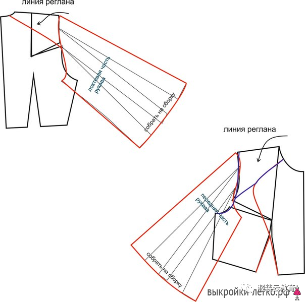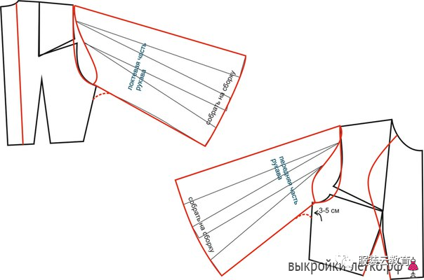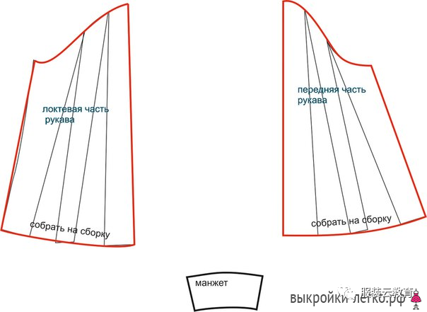 这里很简单,把袖子分成肘和前襟两部分。然后,通过扇形展开这种模拟接收,赋予零件所需的形状和配置。请记住,要减去袖口的长度,在袖子长度上加5-7厘米,以形成袖子底部的体积!我们只需将胸罩零件与袖子零件对齐,稍微调整一下侧移的下缝,再看一遍,检查胸部区域的中心插销宽度,它的线……然后开始裙子。裙子。向底部的毛刺约为1.5 ~ 2cm,通过检查胸罩和裙部的腰部线长度,其余量可沿腰部向侧缝方向推迟(可以顺便保留拉出的数量,并改为折叠)给我一块。其宽度一般不超过3.5-4厘米。(长度可选,但仍低于臀部线))原来的连衣裙是全袖的,但稍微修改一下领口,我们就可以得到一件带有罩衫雷克兰袖的连衣裙,从而使它更封闭。实际上,只有袖子会保持透明,而滑轨和靠背的细节会从基本织物中抽出。