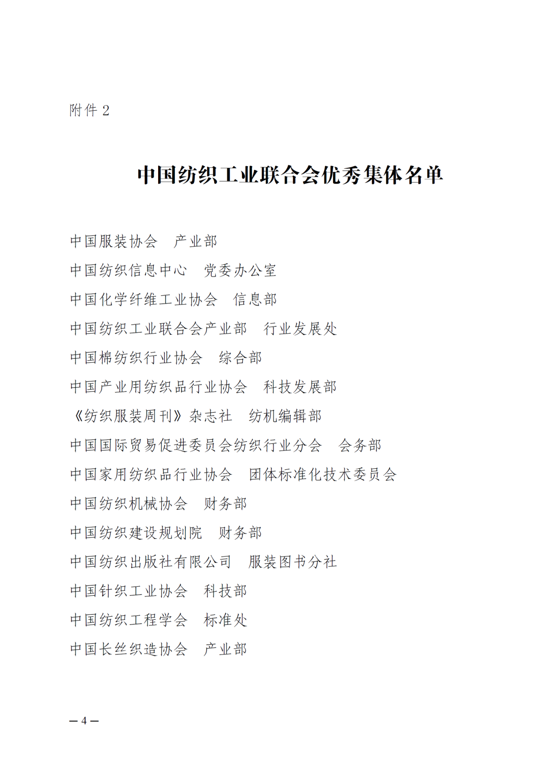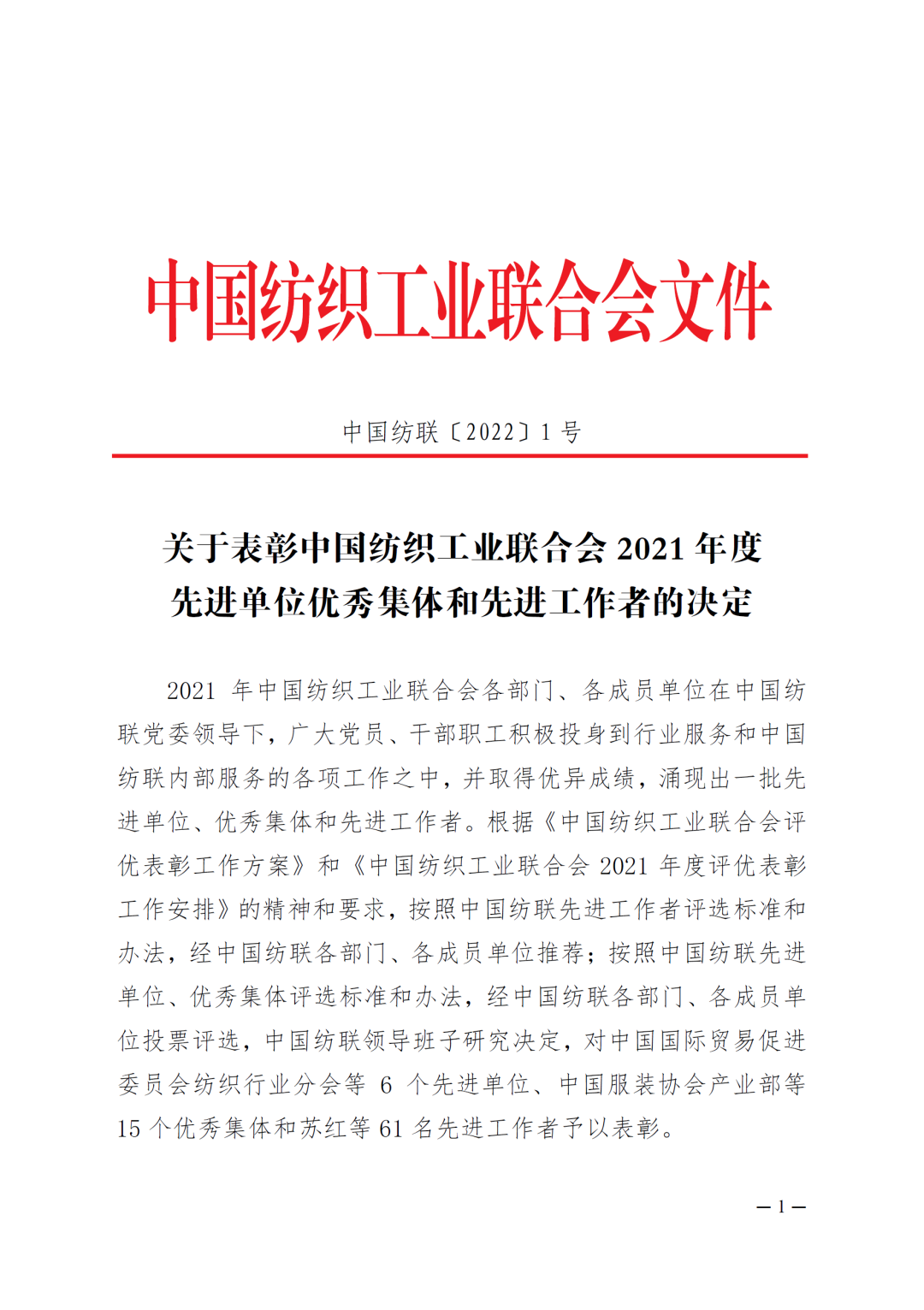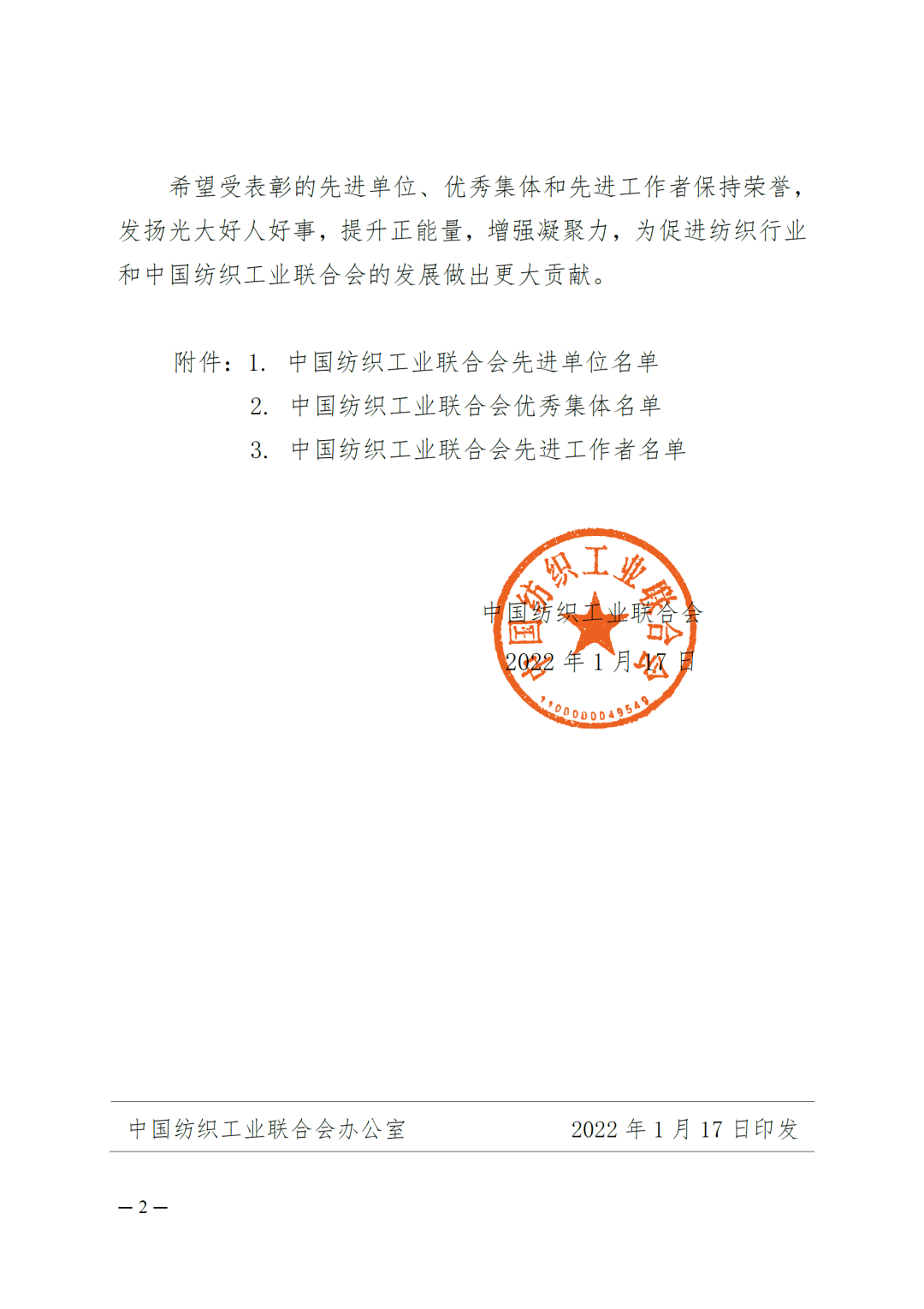 附:《关于表彰中国纺织工业联合会2021年度先进单位、优秀集体和先进工作者的决定》