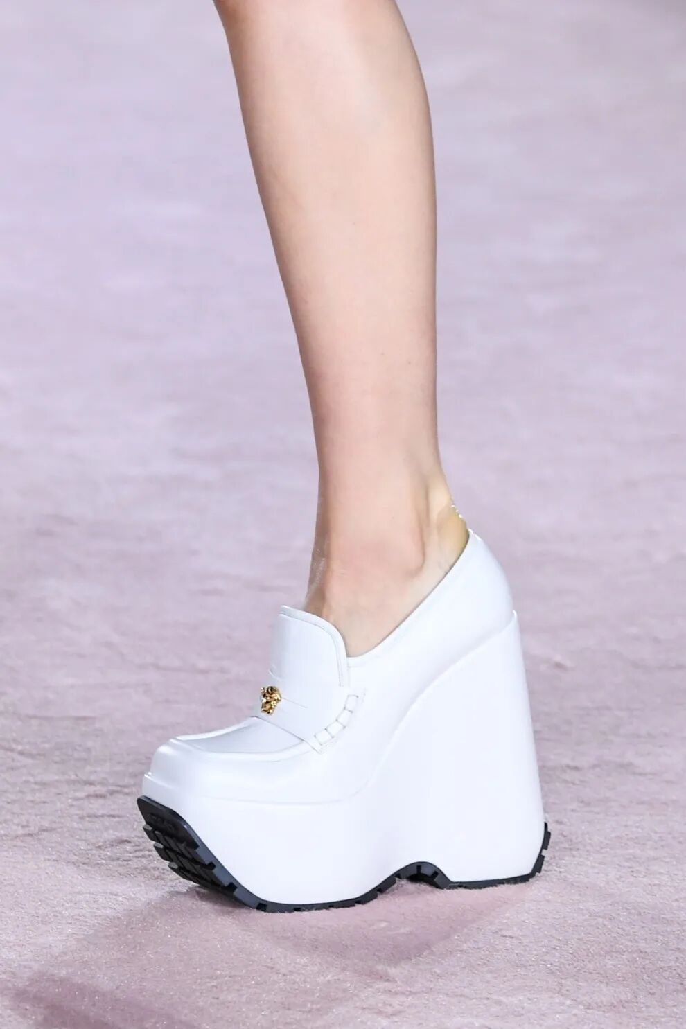 2021年平台极高的鞋履顺利出现在品牌系列中,开始受到全球时尚达人的关注。现在每个人都毫不含糊地准备好迎接 1970 年代高平台的回归,并将这种趋势融入他们的衣柜。Saint Laurent 展示了带有超高平台和细细高跟鞋的漆皮鞋,这些鞋履以前只与 2000 年代的动荡时尚联系在一起,Moschino 选择了点缀着亮片的厚底 凉鞋,而 Versace 则将乐福鞋放在了极高的位置。