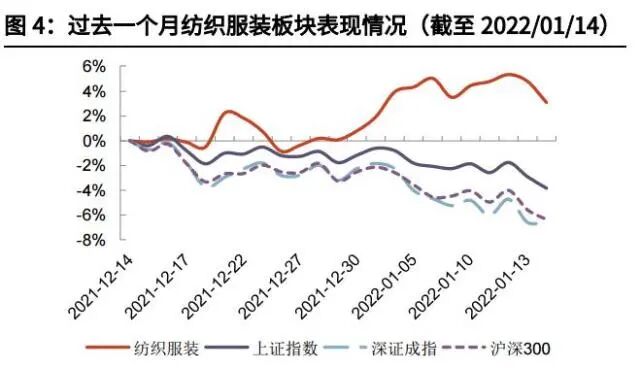 过去一个月(2021年12月15日~2022年1月14日)上证指数、深证成指、沪深300指数涨跌幅分别为-3.83%、-6.52%、-6.40%,纺织服装板块上涨3.08%,位列31个申万一级行业的第5位。