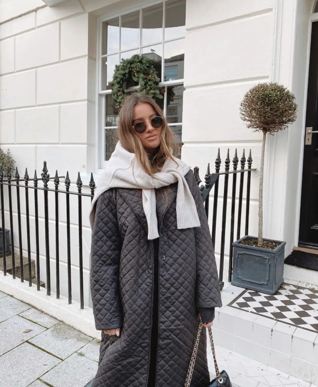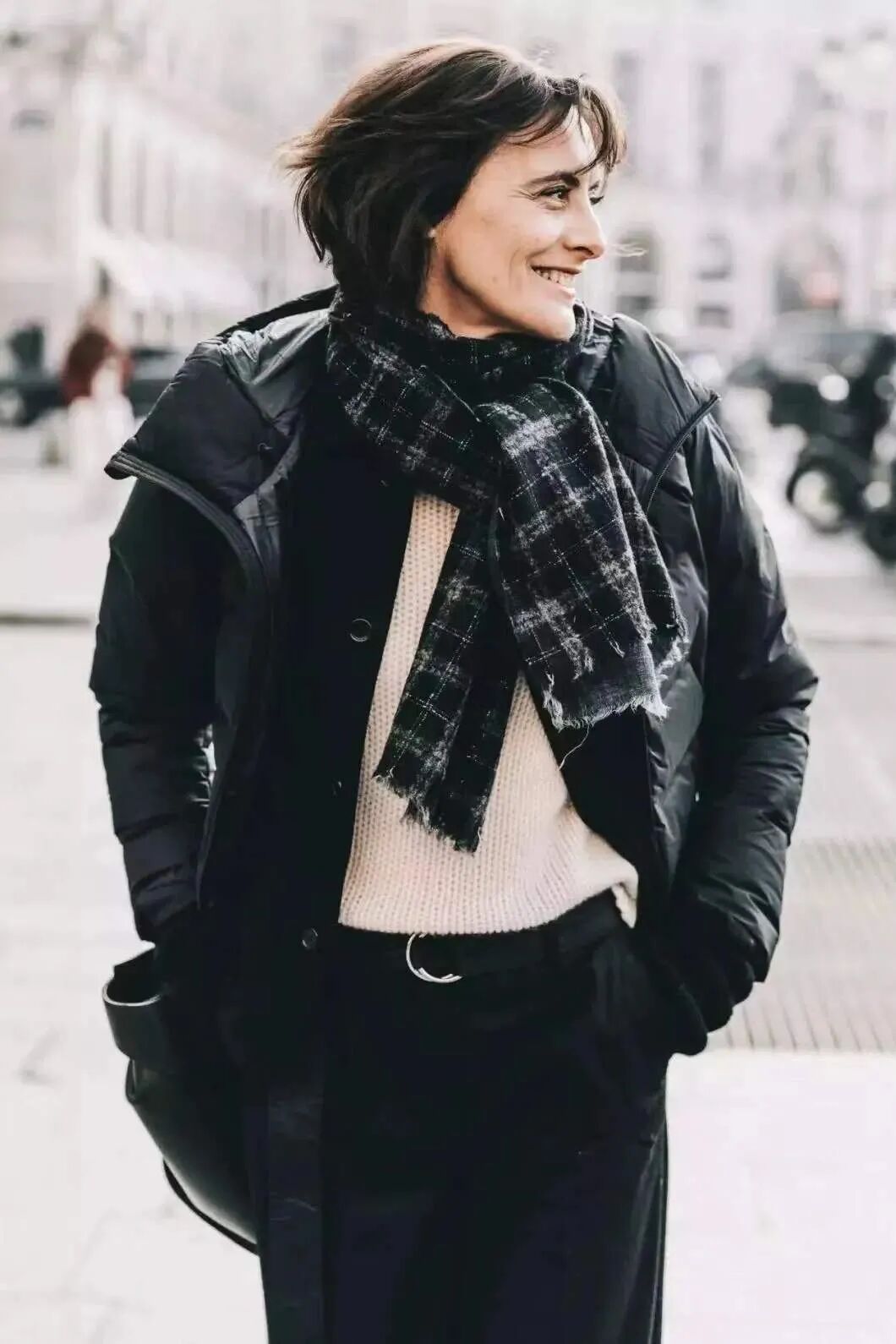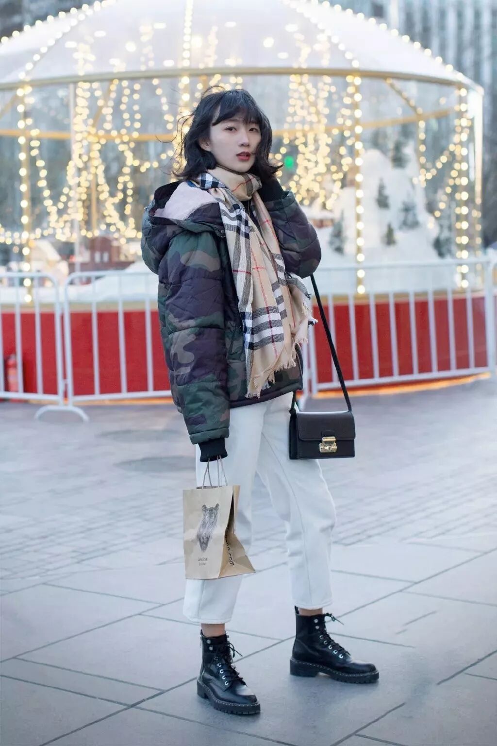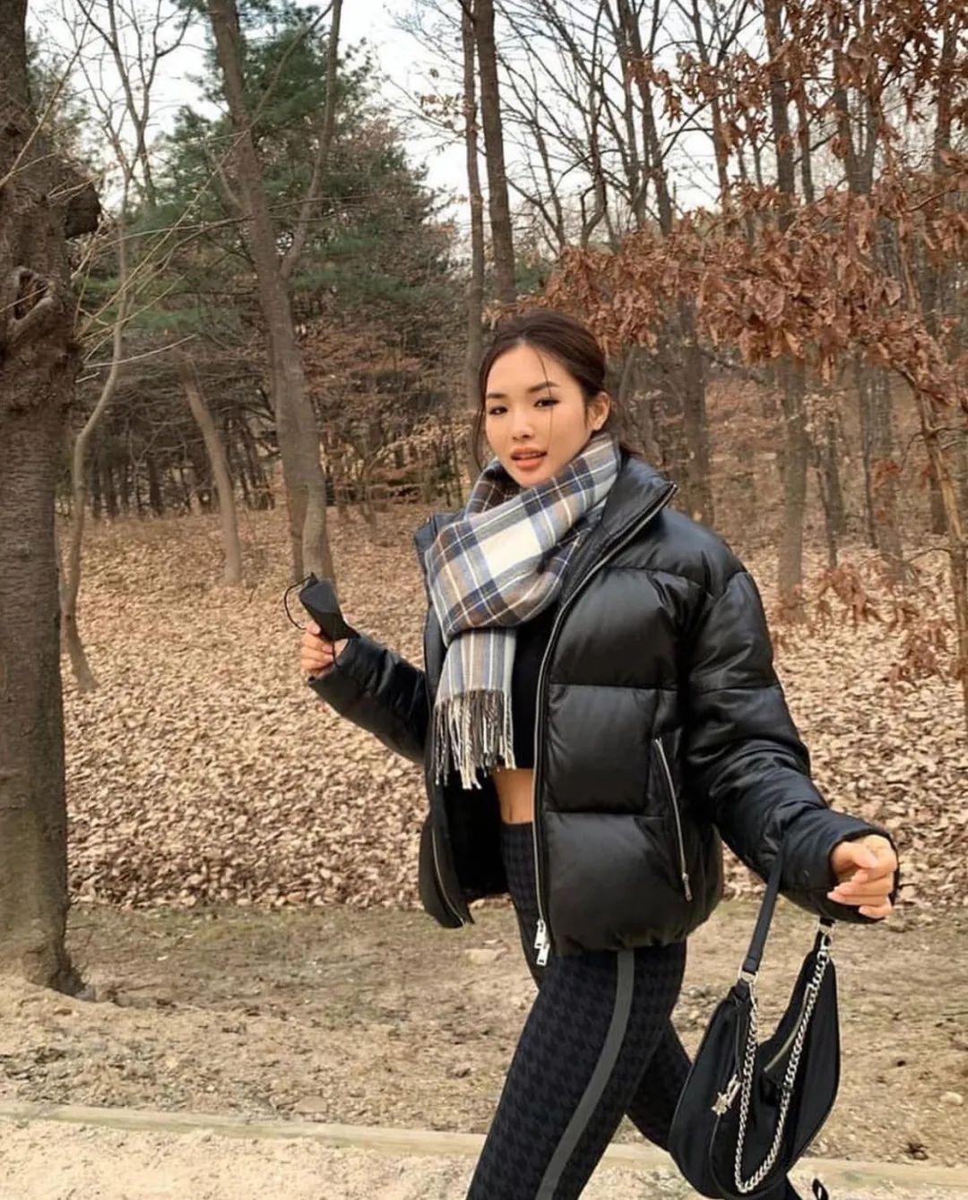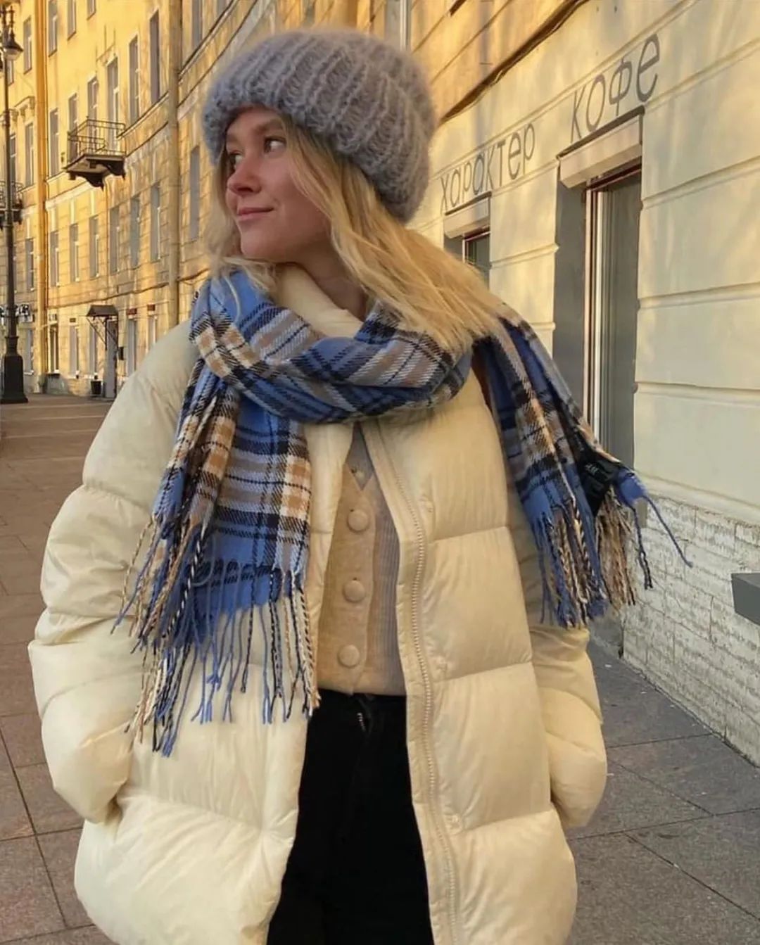 羽绒服+格纹围巾