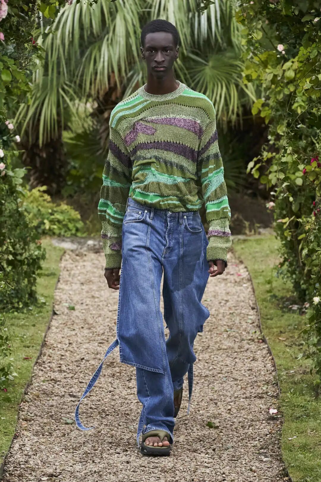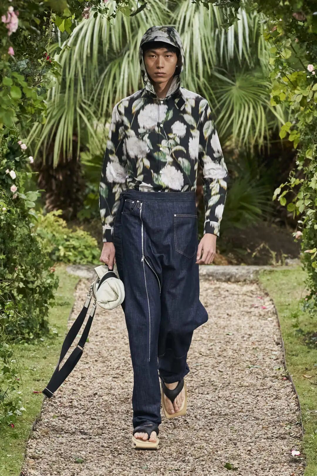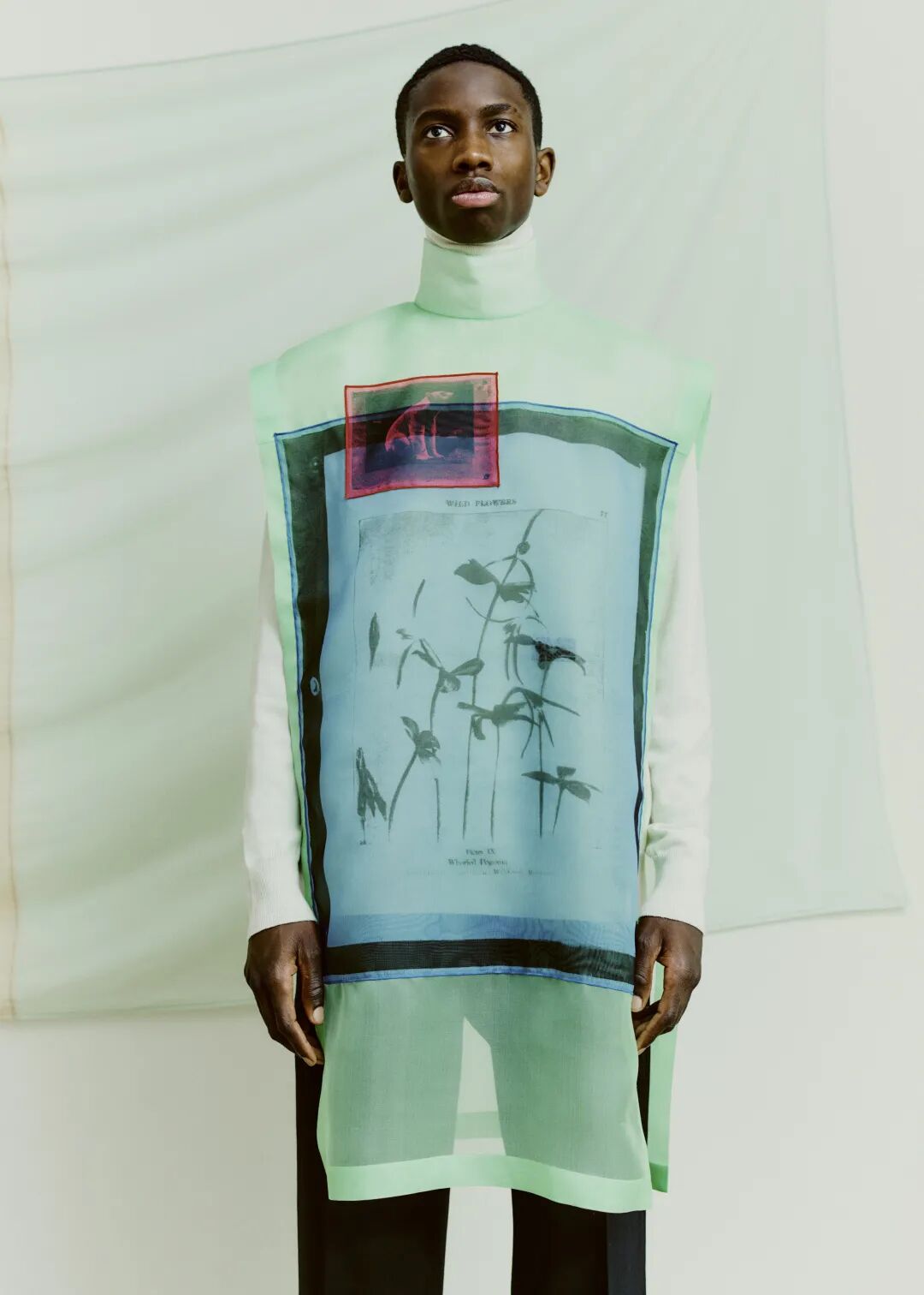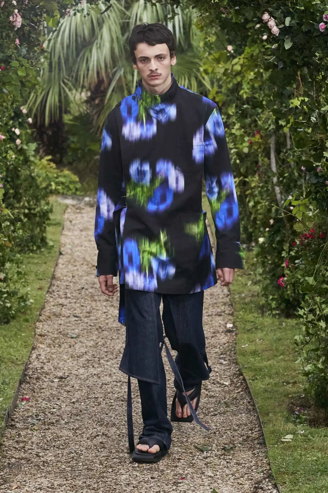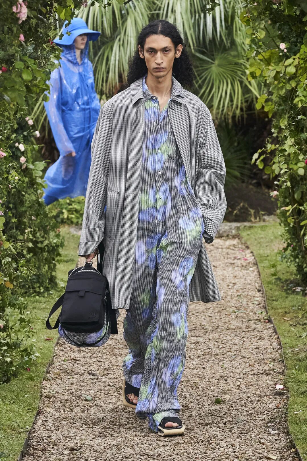 2021春夏系列以蜜蜂与老虎为灵感,将改良工装与养蜂人的防护衣相结合,将原本的防护装束以神秘的头罩造型呈现。廓形风衣、连帽衬衫以及结构牛仔裤都为系列增添穿搭趣味。表面的罂粟花和绣球花的图案通过像素以及滤镜处理,呈现模糊的数字流动感。