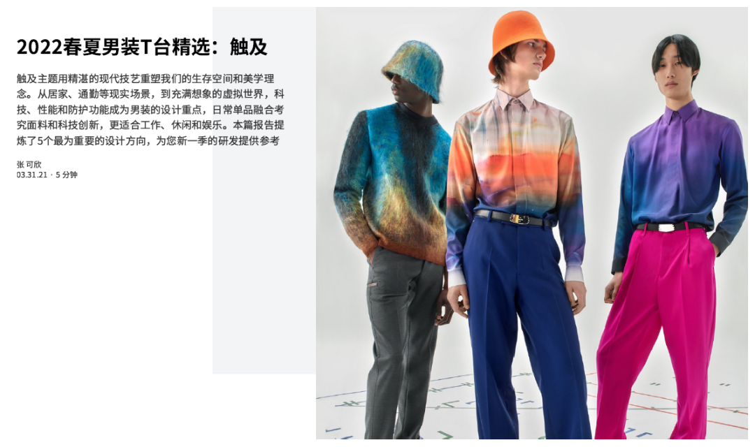 《2022春夏男装T台精选:触及》这篇报告共提炼了5个最为重要的设计方向,本期专栏节选部分,为您新一季的研发提供参考。
