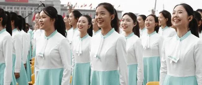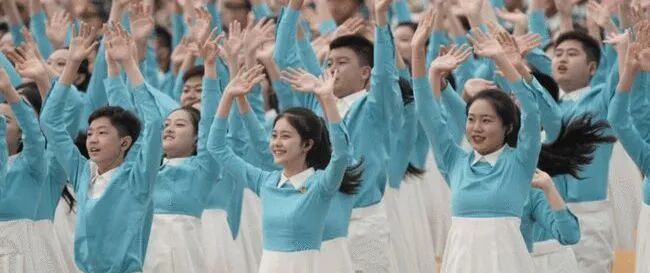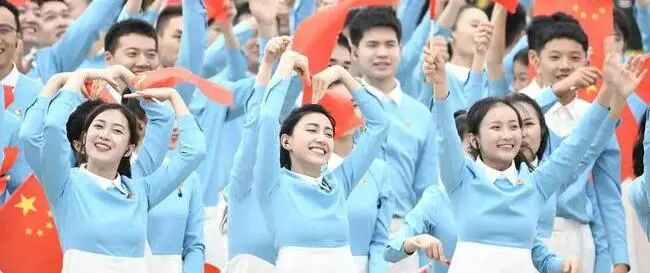 服装设计款式简洁庄重,注重细节和版型,以蓝色和绿色为主色系,与整个广场布置的红、黄色调形成对比关系,与军乐团的绿色、蓝色和白色和谐呼应,展示出中国青少年的时代新风貌。
