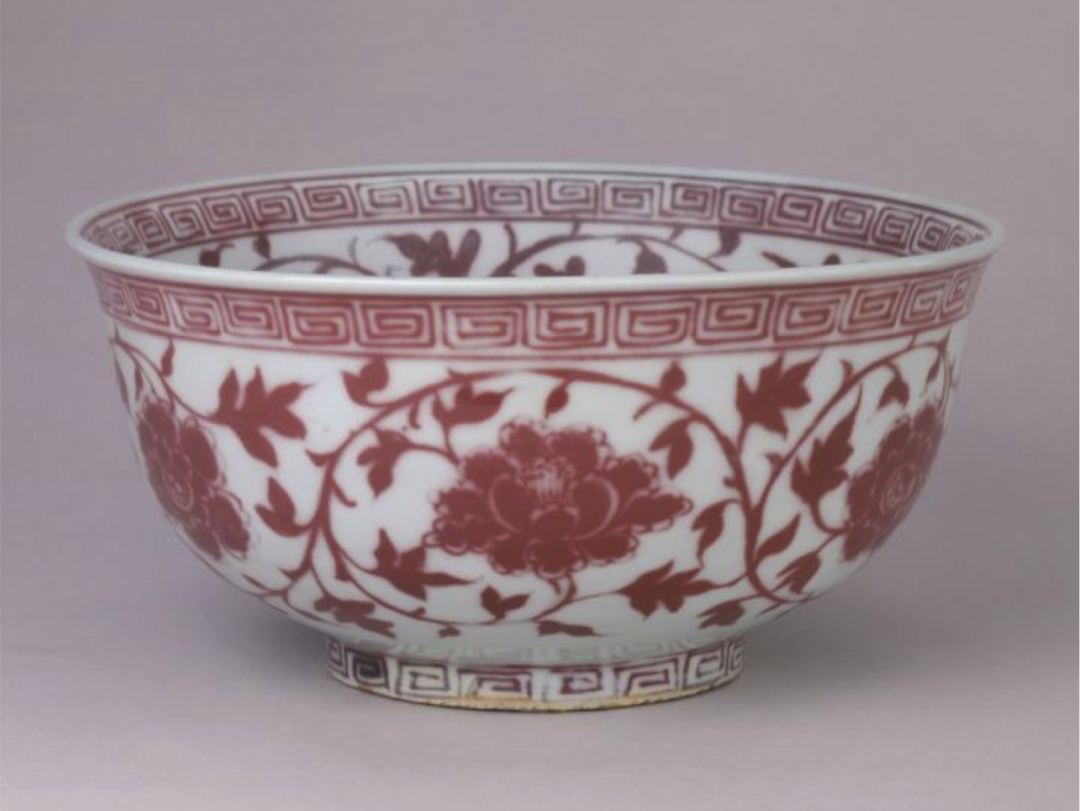 这一设计选取故宫明代洪武“釉里红缠枝牡丹碗”上的纹样作为视觉来源,具有中国特有的美学品质和趣味。图案经过重新归纳后,简洁明快,保留了原图案的典型特征。设计组合成适合女装白色连衣裙下摆的图形,领口露出的牡丹枝叶起到上下呼应的作用,层次更加丰富。
