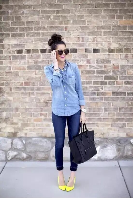 色调统一的衬衫+牛仔裤的搭配太美好了,偏柔软的材质给人感觉更加轻松。