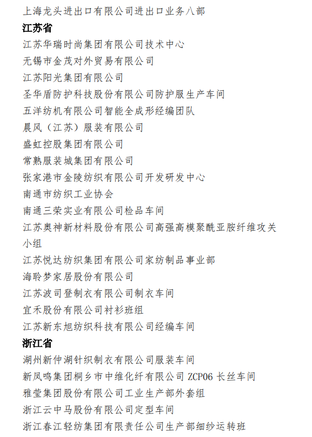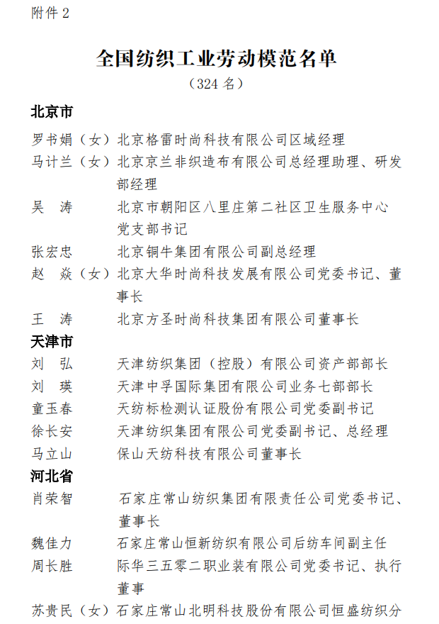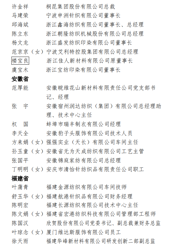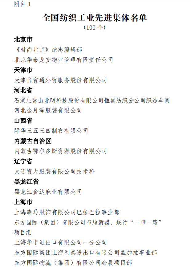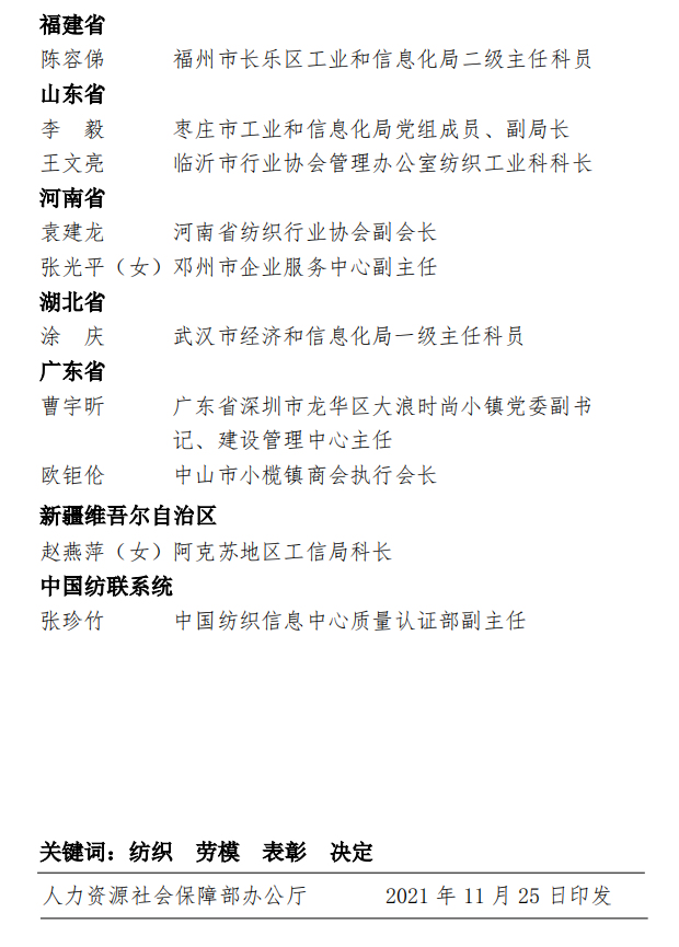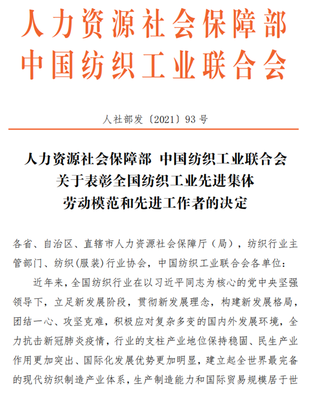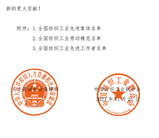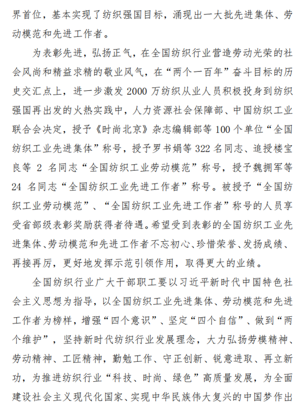 为表彰先进,弘扬正气,在全国纺织行业营造劳动光荣的社会风尚和精益求精的敬业风气,在“两个一百年”奋斗目标的历史交汇点上,进一步激发 2000万纺织从业人员积极投身到纺织强国再出发的火热实践中,人力资源社会保障部、中国纺织工业联合会决定,授予《时尚北京》杂志编辑部等 100个单位“全国纺织工业先进集体”称号,授予罗书娟等322名同志、追授楼宝良等2名同志“全国纺织工业劳动模范”称号,授予魏拥军等24名同志“全国纺织工业先进工作者”称号。被授予“全国纺织工业劳动模范”、“全国纺织工业先进工作者”称号的人员享受省部级表彰奖励获得者待遇。希望受到表彰的全国纺织工业先进集体、劳动模范和先进工作者不忘初心、珍惜荣誉、发扬成绩、再接再厉,更好地发挥示范引领作用,取得更大的业绩。