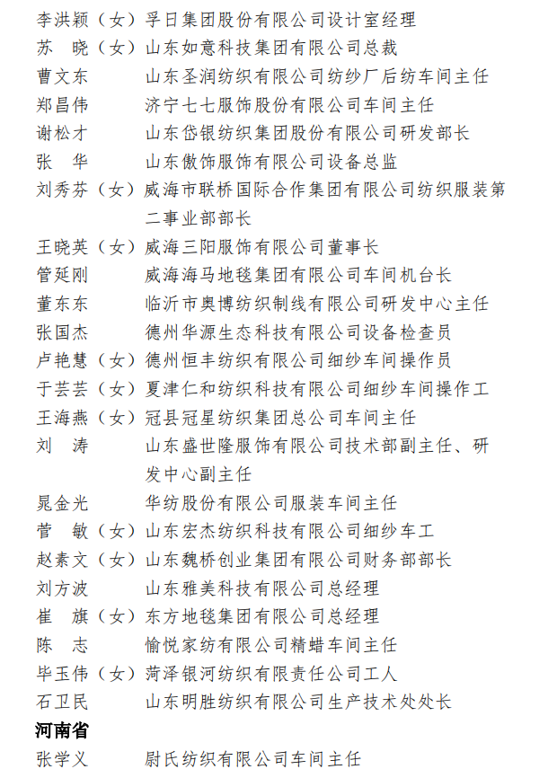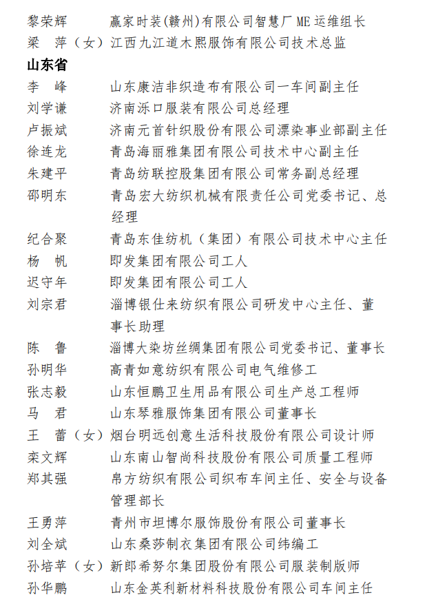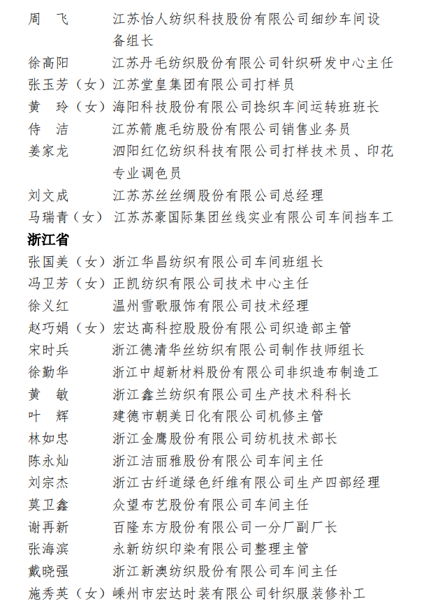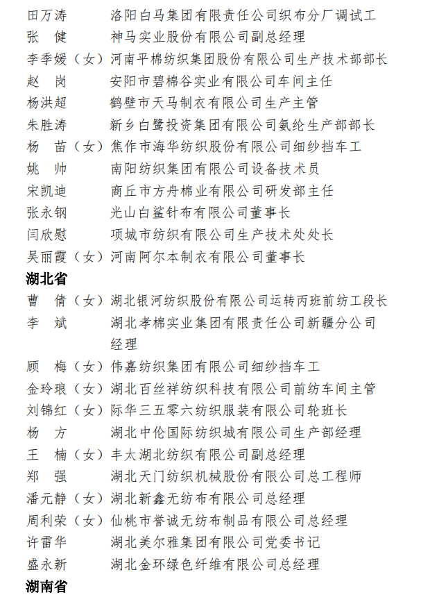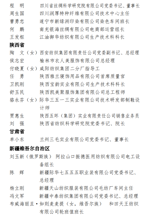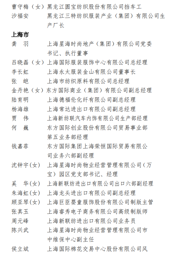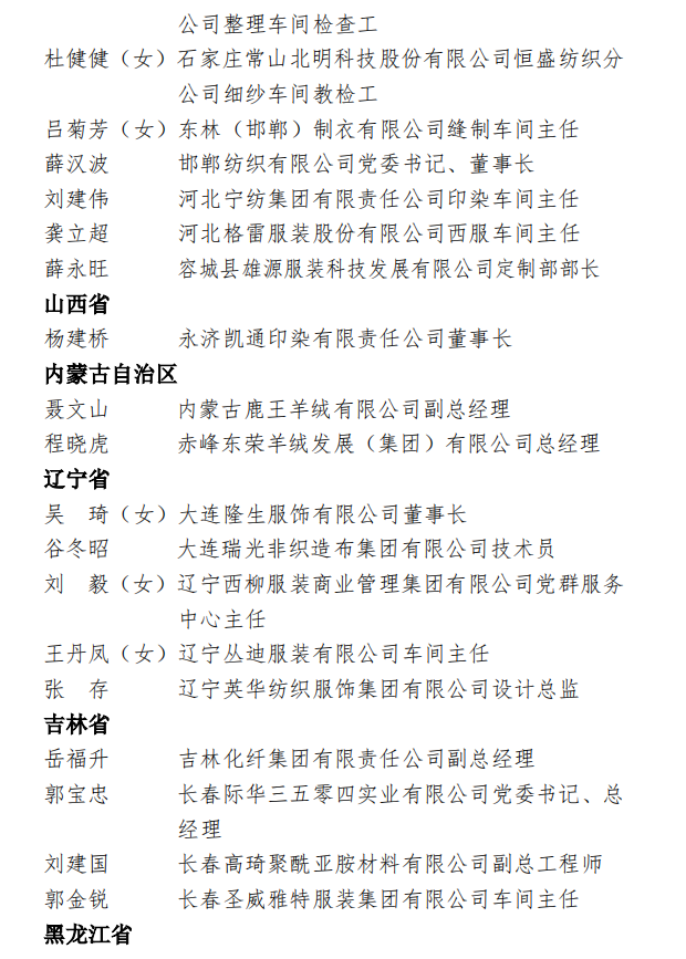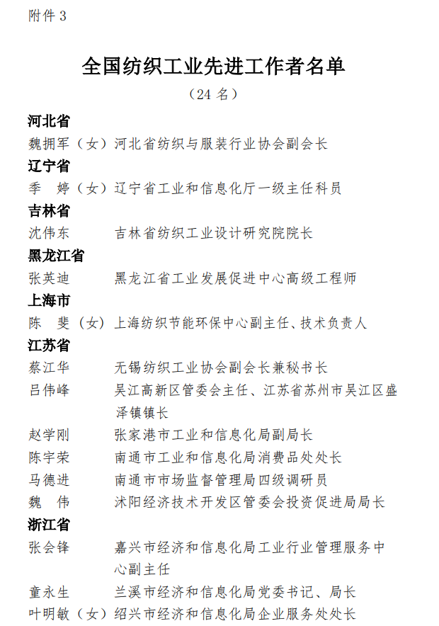 为表彰先进,弘扬正气,在全国纺织行业营造劳动光荣的社会风尚和精益求精的敬业风气,在“两个一百年”奋斗目标的历史交汇点上,进一步激发 2000万纺织从业人员积极投身到纺织强国再出发的火热实践中,人力资源社会保障部、中国纺织工业联合会决定,授予《时尚北京》杂志编辑部等 100个单位“全国纺织工业先进集体”称号,授予罗书娟等322名同志、追授楼宝良等2名同志“全国纺织工业劳动模范”称号,授予魏拥军等24名同志“全国纺织工业先进工作者”称号。被授予“全国纺织工业劳动模范”、“全国纺织工业先进工作者”称号的人员享受省部级表彰奖励获得者待遇。希望受到表彰的全国纺织工业先进集体、劳动模范和先进工作者不忘初心、珍惜荣誉、发扬成绩、再接再厉,更好地发挥示范引领作用,取得更大的业绩。