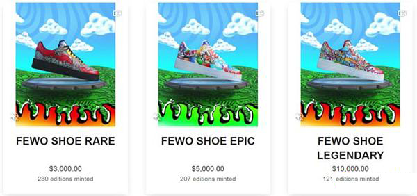 RTFKT Studios与加密艺术家Fewocious合作推出三款NFT运动鞋,定价分别为3000、5000和10000美元,621双鞋在上架7分钟内就迅速售罄,RTFKT Studios和Fewocious净赚310万美元。